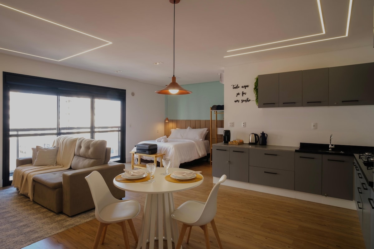 Yeni, iş və ya istirahət üçün səyahət edənlər üçün idealdır, əla yer, Market və Əsas prospektdən 300 metr məsafədə, Floripanın mərkəzindən 10 dəqiqəlik məsafədə yerləşir. Studiya bir insanı və ya bir neçə nəfəri rahatlıqla qarşılamaq üçün nəzərdə tutulmuşdu. Wi-Fi, televizor, soyuducu, soba, mikrodalğalı soba, qəhvədan, qəhvə maşını, elektrik çaydanı və əsas yemək qabları. Binada üzgüçülük hovuzu, fitnes mərkəzi, liftlər, ev heyvanları üçün yer, camaşırxana, fərdi qaraj da var.