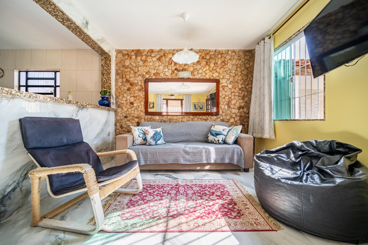 Ailələr və dost qrupları üçün mükəmməl ev. 8 nəfərə qədər. Geniş, qaraj (2 yer), qonaq otağı, 3 kondisionerli yataq otağı (1 süita), divan-çarpayısı olan TV otağı, tam mətbəx, sosial hamam, camaşırxana və böyük eyvan. Wi-Fi, Netflix, PrimeVideo və ClaroTV mövcuddur! Supermarketlər, Havan, Çörəkxana və digər rahatlıqlara yaxındır. Roddan 1 dəqiqədən az məsafədədir. Dep. Márcio Corrêa, RJ-140, San Pedro da Aldeya şəhər mərkəzindən 10 dəqiqə və Kabo Frio şəhər mərkəzindən 20 dəqiqə məsafədə.