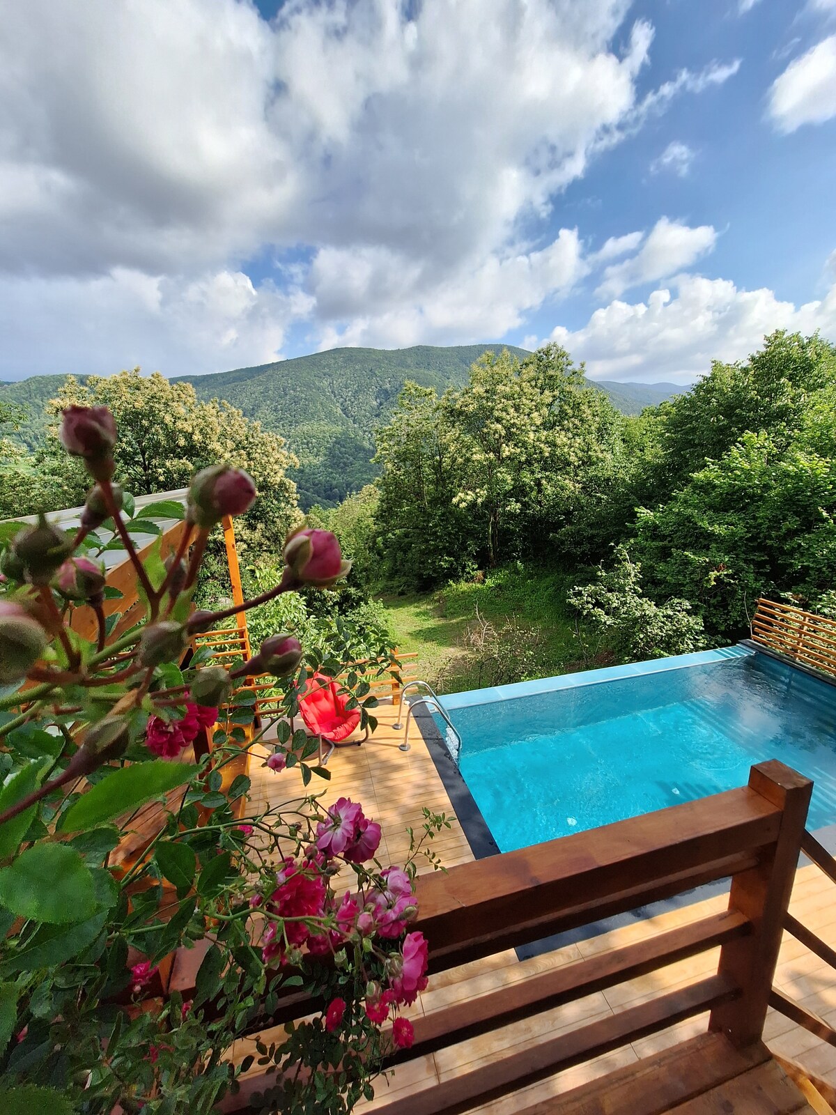 Vadidən mənzərə açılan özəl sonsuzluq hovuzu, günün istənilən vaxtında özünüzü sakit hiss etməyinizi təmin edən unikal atmosfer yaradır. Böyük bağda istədiyiniz kimi vaxt keçirə və barbekü sahəsində sevdiklərinizlə xoş axşamlar keçirə bilərsiniz yaşaya bilərsiniz. Təbiətlə ahəngdar olan, iki yataq otağı və tamamilə taxta arxitekturası olan bu şəxsi villa, zərif detallar, geniş yaşayış sahəsi və panoramik mənzərə ilə dizayn edilmiş interyeri ilə dörd fəsildə rahat qonaqlama təcrübəsi təklif edir.