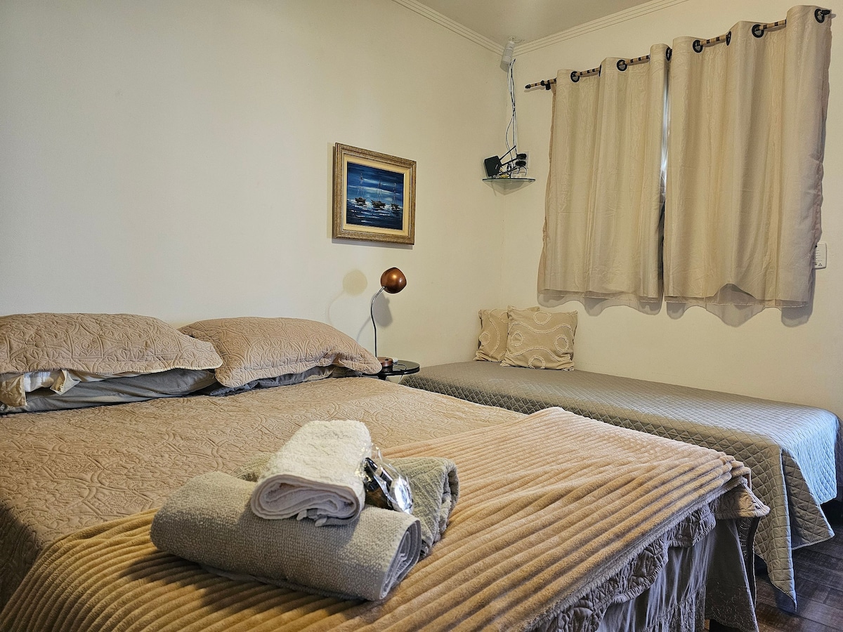 Esqueça de suas preocupações neste lugar espaçoso e tranquilo. Studio privativo com cozinha. 2 camas de casal, 1 delas possui cama de solteiro embaixo só puxar. Sendo a capacidade para até 5 pessoas. Obs: - Não servimos café da manhã. - Não aceitamos pet! - É proibido visitantes! - Área de lazer com piscina compartilhada com todos os hóspedes da pousada.