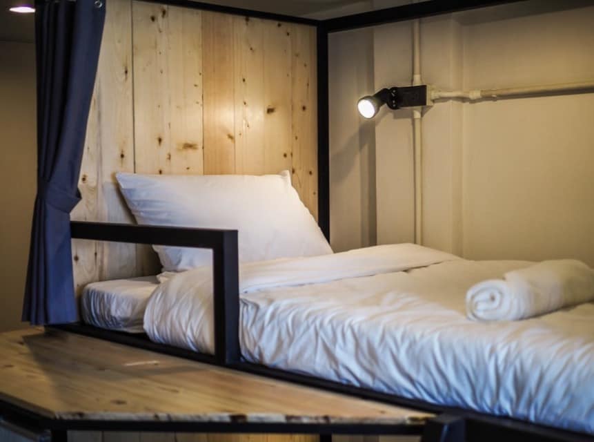 เป็นห้องรวม มีทั้งหมด 8 เตียงในห้องนี้ พักได้ทั้งหมด 10 ท่าน ตัวเลือกนี้คือเตียง B1 สำหรับ 1 ท่าน เตียงชั้นบน แอร์เย็น นอนสบาย มีผ้าม่านกั้นเพื่อความเป็นส่วนตัว โคมไฟหัวเตียงส่องสว่างในโซนของตัวเอง
