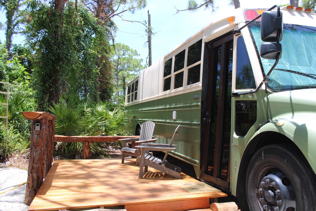 You'll love this unique and romantic escape. This amazing find is custom built. Its minutes to a dozen restaurants and 10 minutes to the best beaches in FL. It has a big kitchen (for a bus), TV and sound system in two rooms, a relatively large bath with shower. and each room has its own AC. It sleeps two in a king sized bed and a great reclining couch facing the TV/fireplace where a child could sleep. Its on a quiet three acres, private, away from our home there.