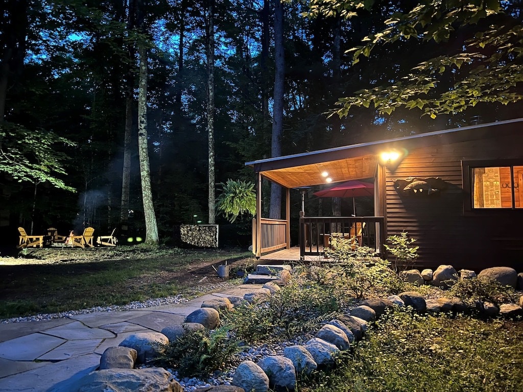 Discover a charming yurt-shaped house perched on a quiet hill with beautiful pond views. Inside is an open concept studio with a comfy king bed, two full futons, a full kitchen, and bathroom. The large deck with dining area is perfect for meals outdoors, and the fire pit invites cozy evenings under the stars. Secluded and hidden from the road, this peaceful retreat offers a magical blend of comfort and nature’s beauty.
