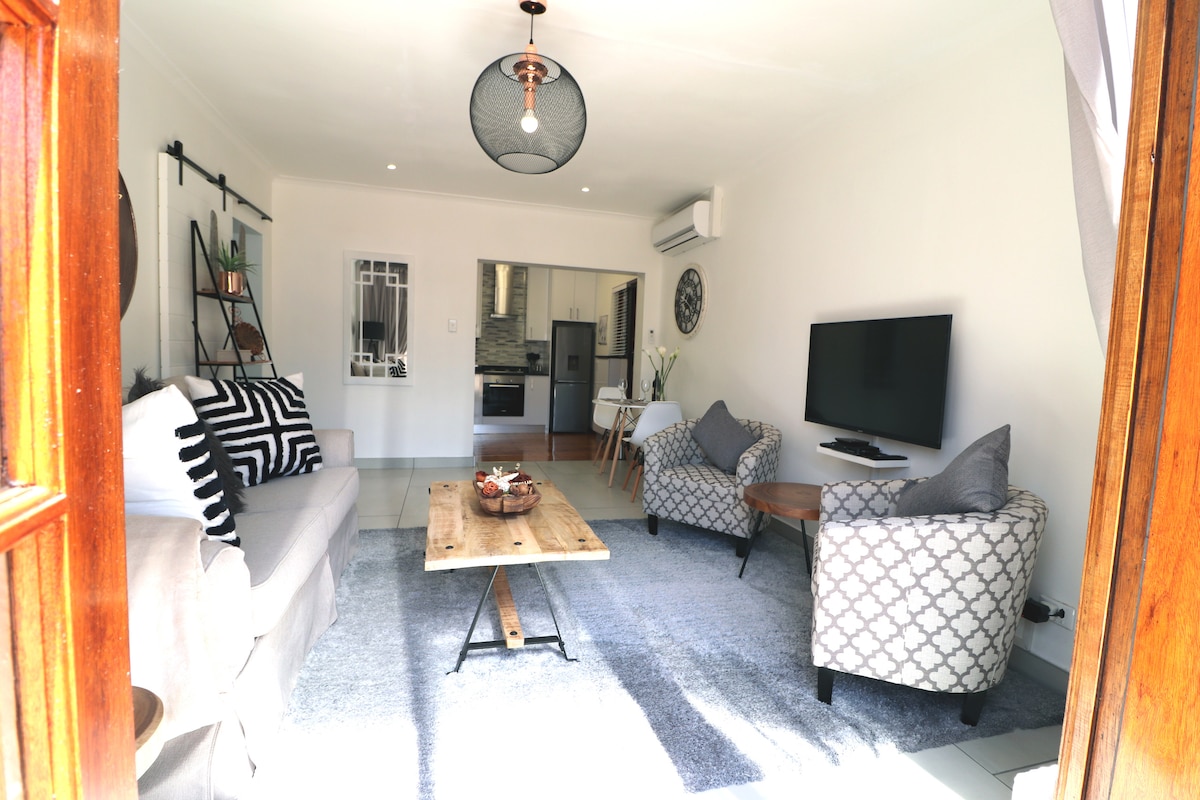 Entire, completely private and free-standing, modern, stylish and spacious, self-catering house is 6 minutes from Airport. Situated in tree filled part of an upmarket suburb, neighbouring the host's safe property, 45m from street. It's EXACTLY as the updated pictures show. Beautiful interior and quality furniture and appliances throughout. Upmarket restaurants and shops under 3 min drive.The private parking for 2 cars and private patio, BBQ, garden, AC and fast WIFI, all for only you to enjoy.