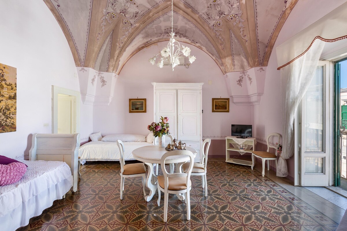 CIS: BR07401291000000188 CIN: IT074012B400033730 Vivi la magica sensazione di trovarti tra passato e presente: è una dimora storica! I pavimenti d'epoca e le pareti in pietra fanno da sfondo a un ambiente arredato con oggetti di design, vecchie ceramiche e mobili locali. L'ampio terrazzo privato, con solarium e doccia calda, saprà entusiasmarti: potrai rilassarti con un bicchiere di vino al tramonto, godere del sole su comodi lettini o preparare una cena in una magica atmosfera pugliese.