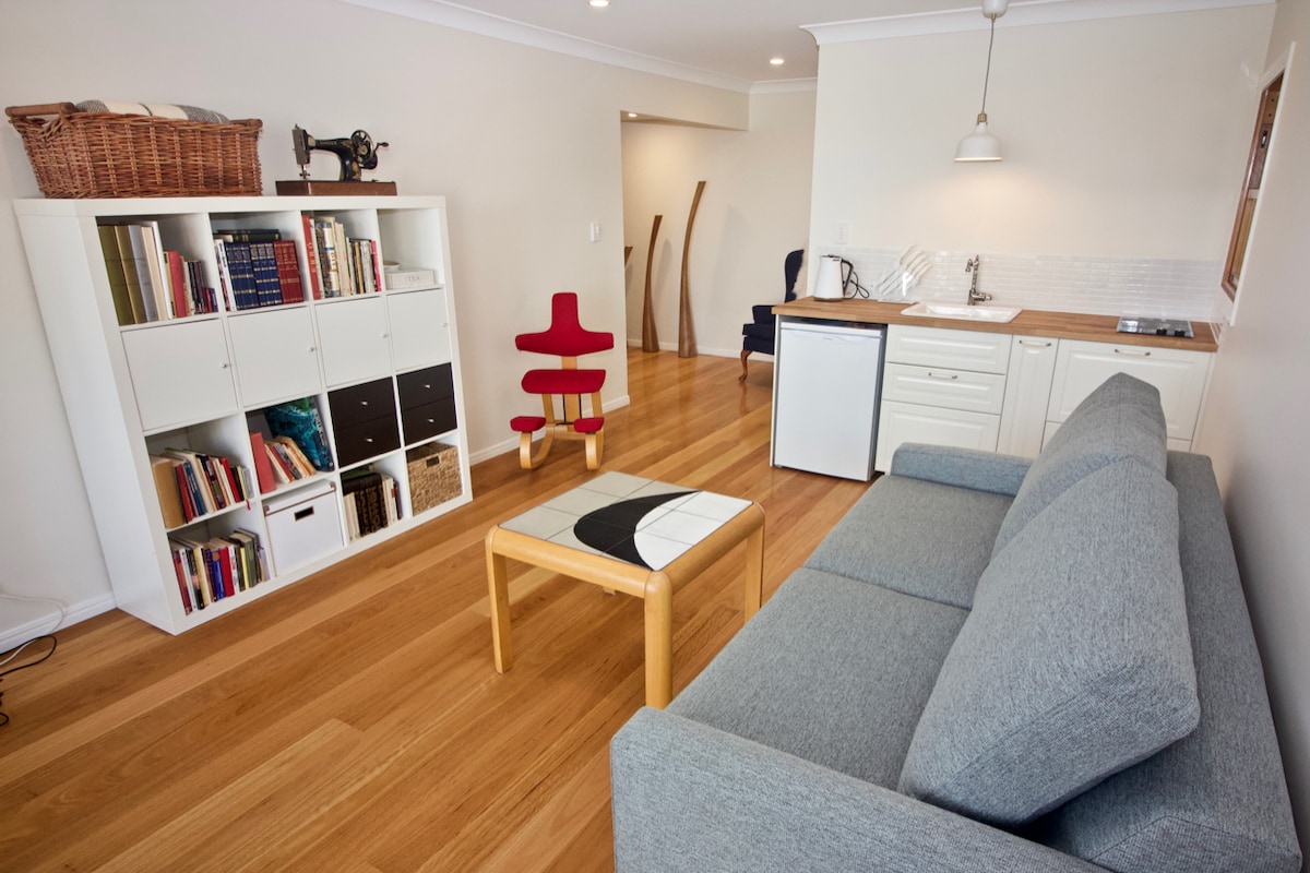 Large, light décor, main room with queen bed, kitchenette and dining, separate and very private bathroom, plus external deck. Very close to shops and medical, restaurants, cafes, pizzas, liquor outlet, small supermarket, dentist; a nearby National Park. Note - this is a secluded area of comfort and not suited to children, babies, infants of any age. Please accept apologies for this unavoidable policy. Nor is it a suitable place for wedding preparations, gatherings or any events.