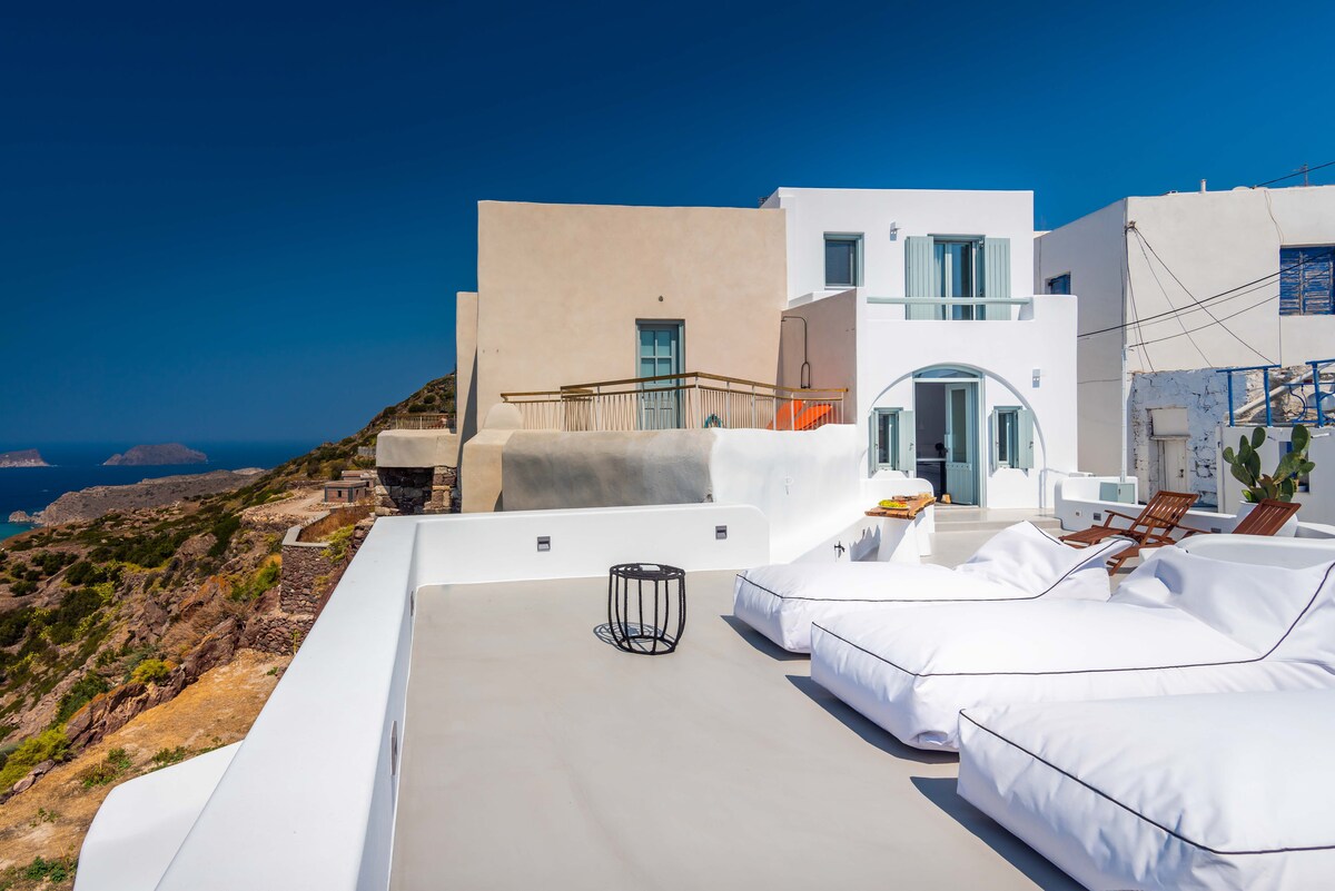 An open space beach house, of 60 s.m. for 6 pax with 1 double bed, 2 sofa beds and 2nd room with 2 single beds very stylish and comfortable. It is decorated with boho and cozy design styling combined with Cycladic culture. The house has direct access to a sea view veranda, with a big dining table. It is situated on a small bay, with similar moon white rocks as Sarakiniko that form a secluded cove in front of the house, together with Aqua house 1 & 3. Welcome basket with local products offered.