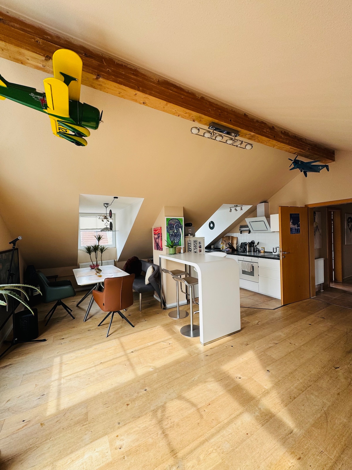 Es handelt sich um eine 80m2 Dachgeschoss Wohnung auf 2 Ebenen (1 Stock: Diele, Garderobe, Einbauschrank, Duschbad/WC, 2. Stock: Loft mit kompletter Küche, Bar, Esstisch, Couch (bzw Schlafcouch), Schreibtisch, Kaminofen, Doppelbett, Badezimmer (WC/Wanne/Waschmaschine) u. Klappbett bei Bedarf. Monoblock Klimabox. Nachbarschaft ruhige Wohnsiedlung direkt am Waldrand. Parken überall immer leicht möglich. S-Bahn 7 min Fußweg oder 1min Bus. 15min Fahrtzeit bis Marienplatz.