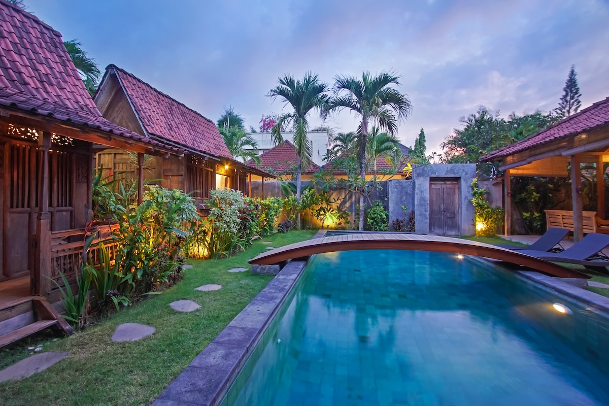 Villa Lodek Deluxe Seminyakın mərkəzində yerləşən və palmalar, franqipani və təbii bambuklu yamyaşıl bağlarla əhatə olunmuş xüsusi tropik istirahət məkanı təklif edən gizli bir incidir. Bu canlı rayonda nadir təam olan vəhşi quşların melodiyalarına diqqət yetirin. Villa geniş qazona, uzun hovuza və zərif müstəmləkə dizaynına malikdir.