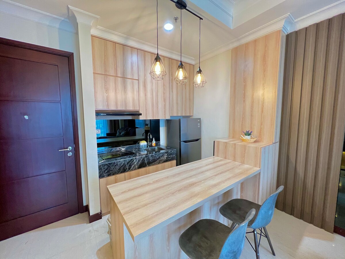 An elegant 24sqm studio in Jakarta's center, blending style and convenience. Includes kitchen, fast Wi-Fi, air-purification, 43" smart TV, sound system and Netflix. It is ideal for various stay types, with contactless access and amenities like pools, jacuzzi, gym, and basketball, Now features a Reverse Osmosis dispenser & food waste disposal, The picture shows a gas stove that has been replaced by an induction cooker (to follow the apartment guidelines for fire hazards)
