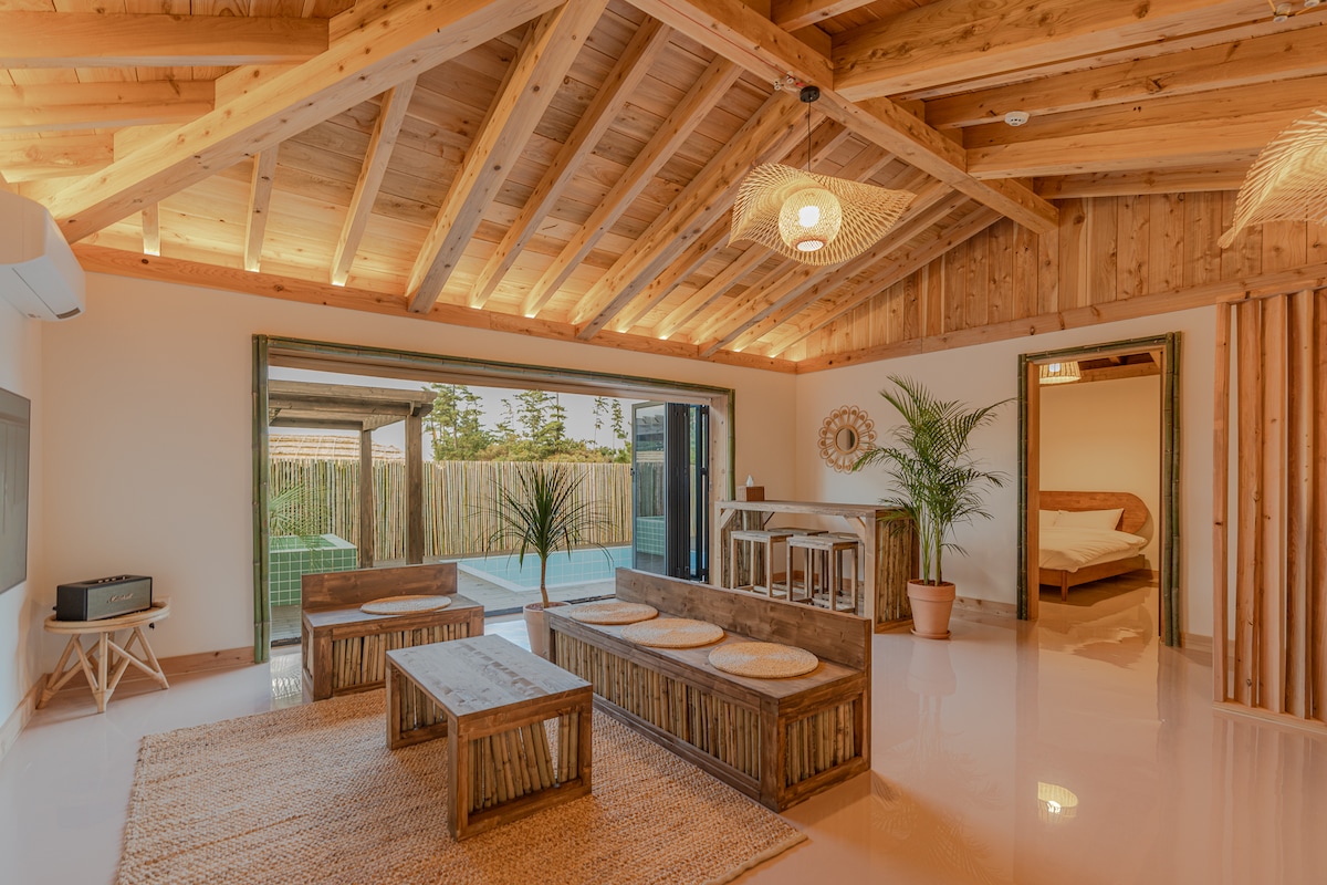 제주도의 자연을 잘 표현하고자 제주의 돌담 이끼 정원과 따뜻한 우드톤의 객실로 이루어진 4계절 무료 온수 자쿠지가 가능한 독채 숙소입니다. 1층방에는킹 사이즈 침대1개 다락방에는 퀸 사이즈 평상형 침대 1개 (추가침구 셋팅 가능) 도보 5분 거리에 런던베이글과 몽탄등 유명 식당과 카페들이 있습니다. 비가 와도 무료로 이용 가능한 온수 무료 자쿠지 이며 성인 4명~6명이 같이 이용 가능한 크기라서 영/유아 아이들에게는 수영장처럼 안전하게 이용하시면 됩니다. (영유아용품 무료 제공: 아기침대. 식탁의자, 분유포트, 튜브,욕조) 다락방의 바다뷰는 손님들이 가장 좋아하는 공간이기도 합니다. 무료 전기 자동차 충전 시설/숙소 전용 주차장 정원에서 바베큐와 불멍도 가능하며 별도의 추가금액이있습니다. 기본 숙박 성인 3인 (추가 1인 당 1박은 2만원) 최대 인원 성인 4명입니다