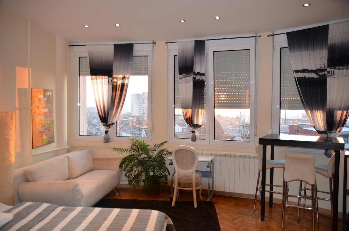 Bu müasir studiya mənzili Belqradın mərkəzində, canlı Knez Mihajlova piyada küçəsindən cəmi 2 dəqiqə uzaqlıqda yerləşir. Bu mənzil tək səyahətçilər, cütlüklər və ya 4 nəfərlik kiçik qruplar üçün mükəmməl olan Belqrad və Sava çayının heyrətamiz panoramik mənzərələrini təklif edir. Qısamüddətli qonaqlama və ya daha uzunmüddətli qonaqlama axtarmağınızdan asılı olmayaraq, bu mənzil Belqradda keçirdiyiniz vaxtdan maksimum yararlanmağınıza və həqiqətən unikal təcrübədən zövq almağınıza imkan verir.