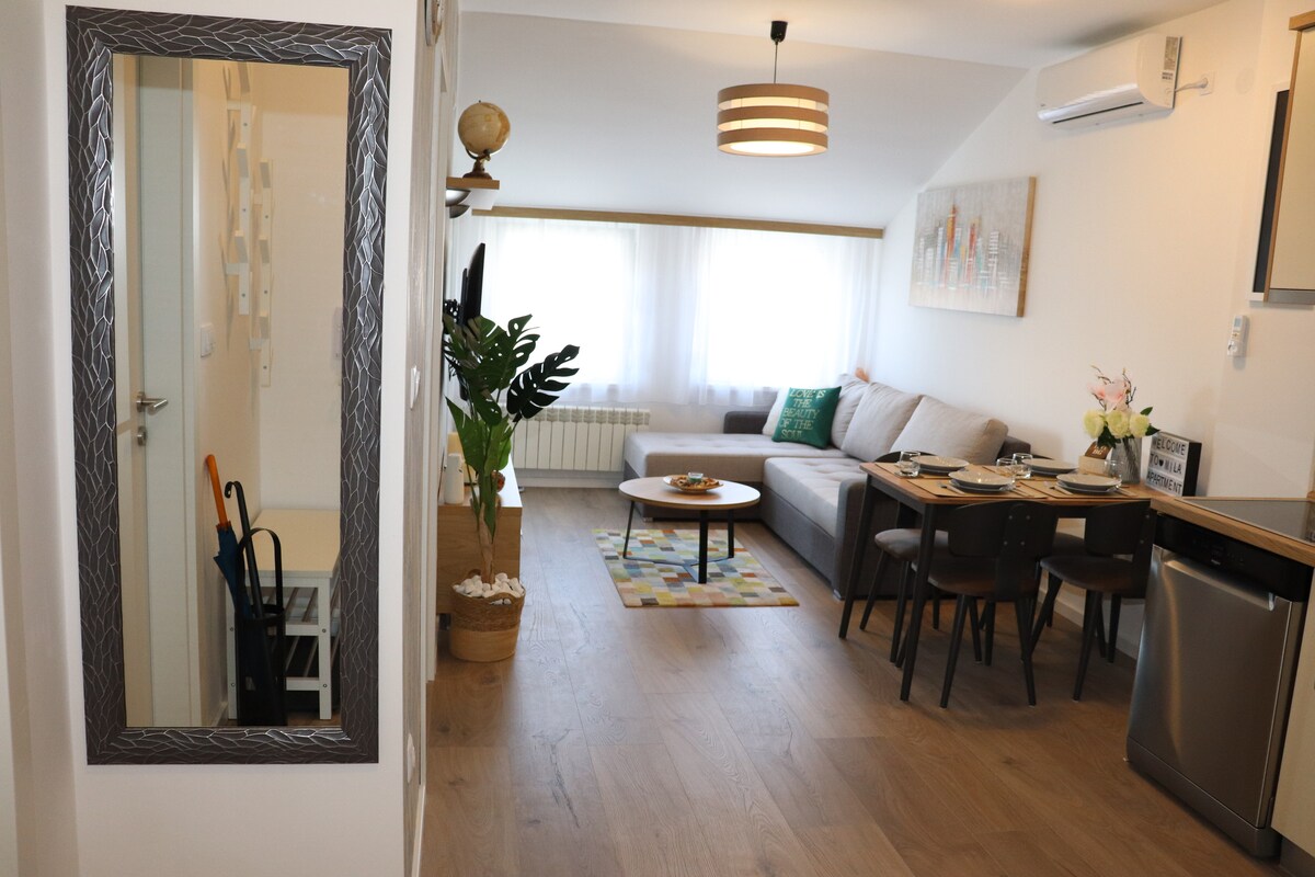 Mənzil Belqradın mərkəzindəki Bohemiya məhəlləsində (barlar, restoranlar, klublar, alış-veriş mərkəzləri, fermer bazarı və s.) mükəmməl şəkildə yerləşir və 1-4 qonaq yerləşdirir. O, üçüncü və sonuncu mərtəbədə yerləşdirilib. Yataq otağında və divan otağında iki nəfərlik çarpayı təşkil edilə bilər. Mətbəx tam təchiz olunub, həqiqətən tam təchiz olunub.Dinləmə masası qış vaxtı terrasda və ya konservatoriyada olur. Hamam otağı böyük vitraj pəncərəsi və paltaryuyan maşını ilə yaxşı təşkil olunub...
