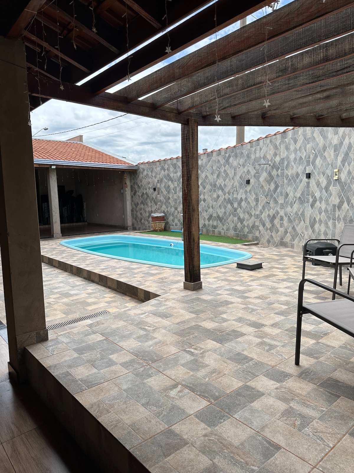 Espaço Caetano! Área de lazer super aconchegante para passar uns dias com sua família e amigos, acomodação elegante e agradável. . Piscina . Tv . Som . 6 jogos de mesa . Mesa em madeira . Geladeira . Fogão . Ventiladores . Wi-Fi . Churrasqueira . Gás . 2 bistrôs . Banquetas . Capacidade de 80 pessoas Obs. Levar colchão, não disponibilizamos!