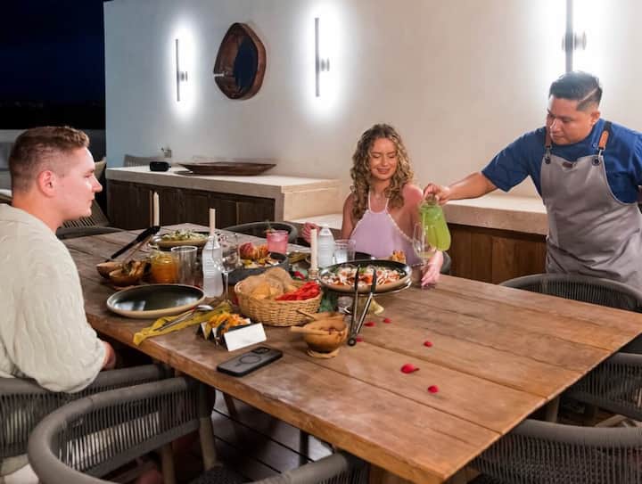 Riviera Maya sahilində yüksək keyfiyyətli 4 növbəli şəxsi şam yeməyi ilə gecənizi daha da unudulmaz edin. Aşpaz Cair təfərrüatlara düşünülmüş təamlar və teksturalar turunda sizə bələdçilik edəcək. Hər bir yemək onun unikal təcrübəsini və toxunuşunu əks etdirən, təəccüb və cazibədarlıq üçün yaradılmış bir şah əsəridir. Axşamınızı unudulmaz bir an, bir cütlük kimi və ya cənnətdə dostlarınız və ailənizlə birlikdə xüsusi bayramlar üçün mükəmməl edəcək qüsursuz xidmət və müstəsna yeməklərdən zövq alın.
