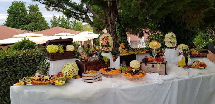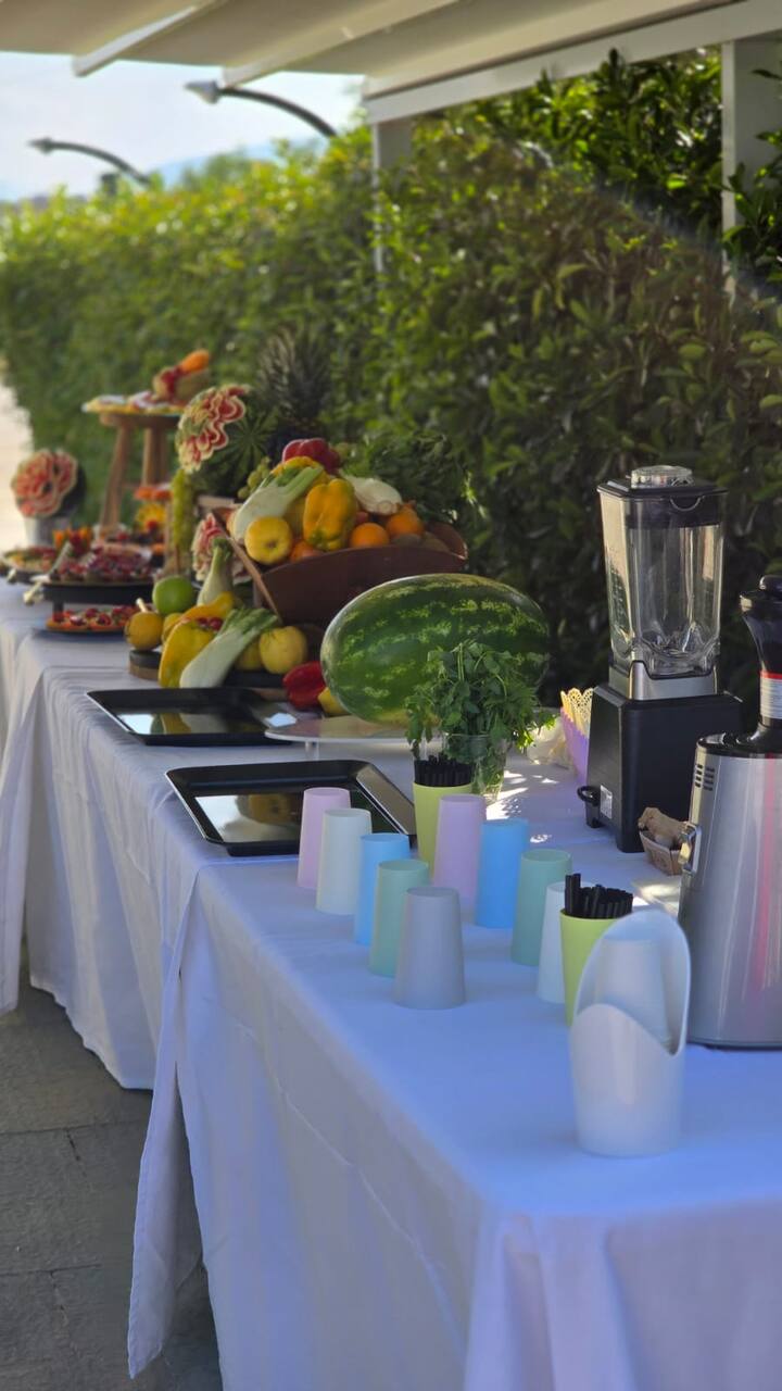 Bu, aperitivlər, şəxsi mərasimlər və ya şirkət tədbirləri üçün uyğun olan zərif bir formuldur. Təqdimatda yaradıcı bir tədbir üçün ideal olan təzə meyvələrdən hazırlanmış çəngəl-bıçaq, boşqablar, heykəlciklər və kokteyllərdən ibarət bufet var.