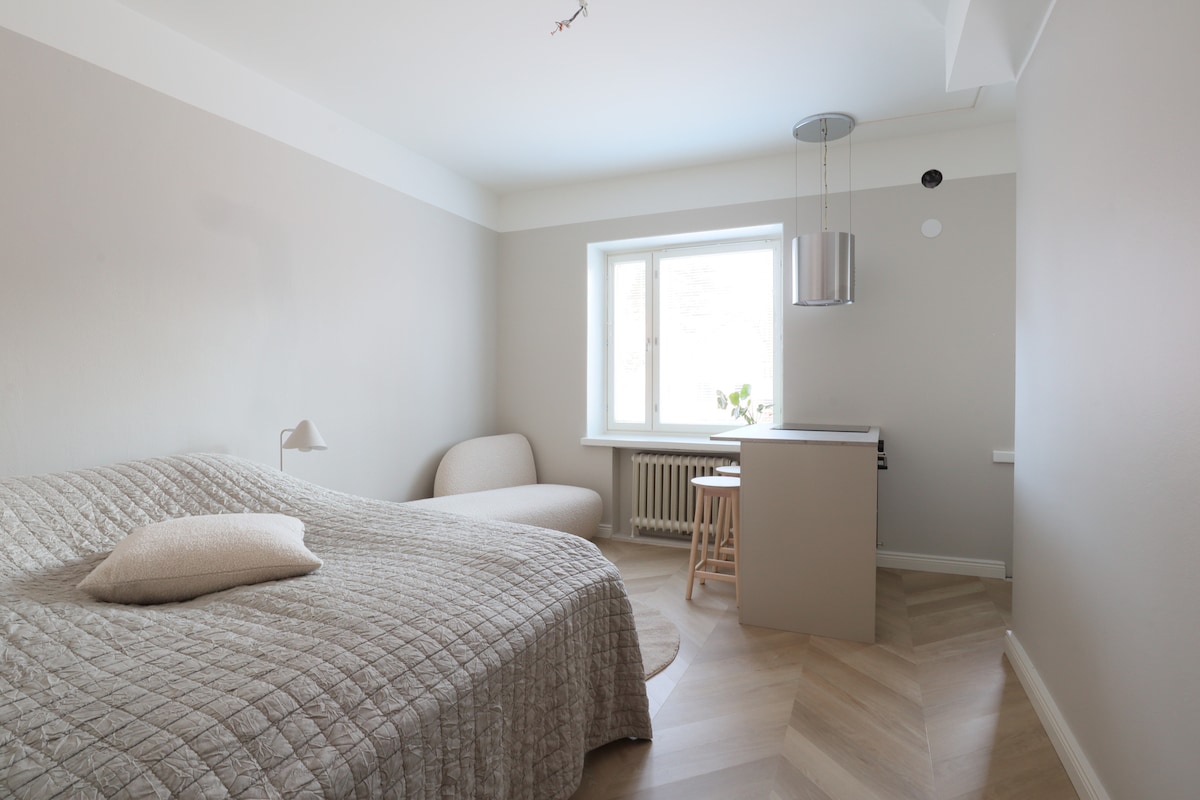 Welcome to your recently renovated city center studio apartment in Helsinki! Situated in a prime location, the stylish space is steps away from attractions, cafes, and restaurants. The building, dating back to the 1920s, boasts high ceilings and wide windowsills, adding charm. Inside, enjoy amenities like high-speed WiFi, Netflix on a 55" TV, a hairdryer, and an iron. The apartment comfortably sleeps up to four. Book your stay for a perfect urban retreat in Helsinki!