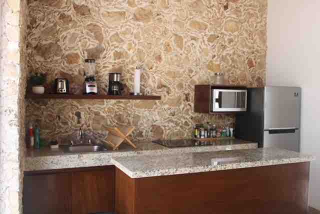 Es un alojamiento completo con alberca privada. Propiedad ubicada a unos pasos de la famosa calle 59, llena de cafés, restaurantes y bares. La decoración es colonial, la sala con sofá, tv de 50" con Netflix, Wi Fi, comedor para 6 personas, cocina con estufa de inducción magnética , refrigerador, horno de microhondas, 1 dormitorio con cama king size, TV de 32”, 1 aire acondicionado, ropero, baño con agua caliente y terraza con alberca. El Aire acondicionado solo hay en la habitación .