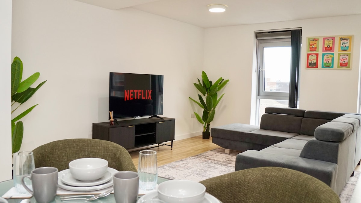 Şeffild Şəhər Mərkəzindən sonra çox çeşidli iki yataq otaqlı təsirli, dəbli və müasir böyük iki otaqlı mənzil. Kral ölçüsü, otaqda yataq otağı və ikimərtəbəli yataq otağı ilə. Bu, şübhəsiz ki, Şeffild şəhərinin təklif etdiyi hər şeyin yanında dostlarınız, həmkarları və ya ailənizlə qonaqlama üçün əyləncəli məkandır. İki böyük yataq otağı | Daha böyük mətbəx | Daha böyük qonaq otağı | Böyük təmiz duş | Masaj stulu | Əla 65" TV, Prime, Disney, NetFlix, Fiber WIFI, Audio və s.