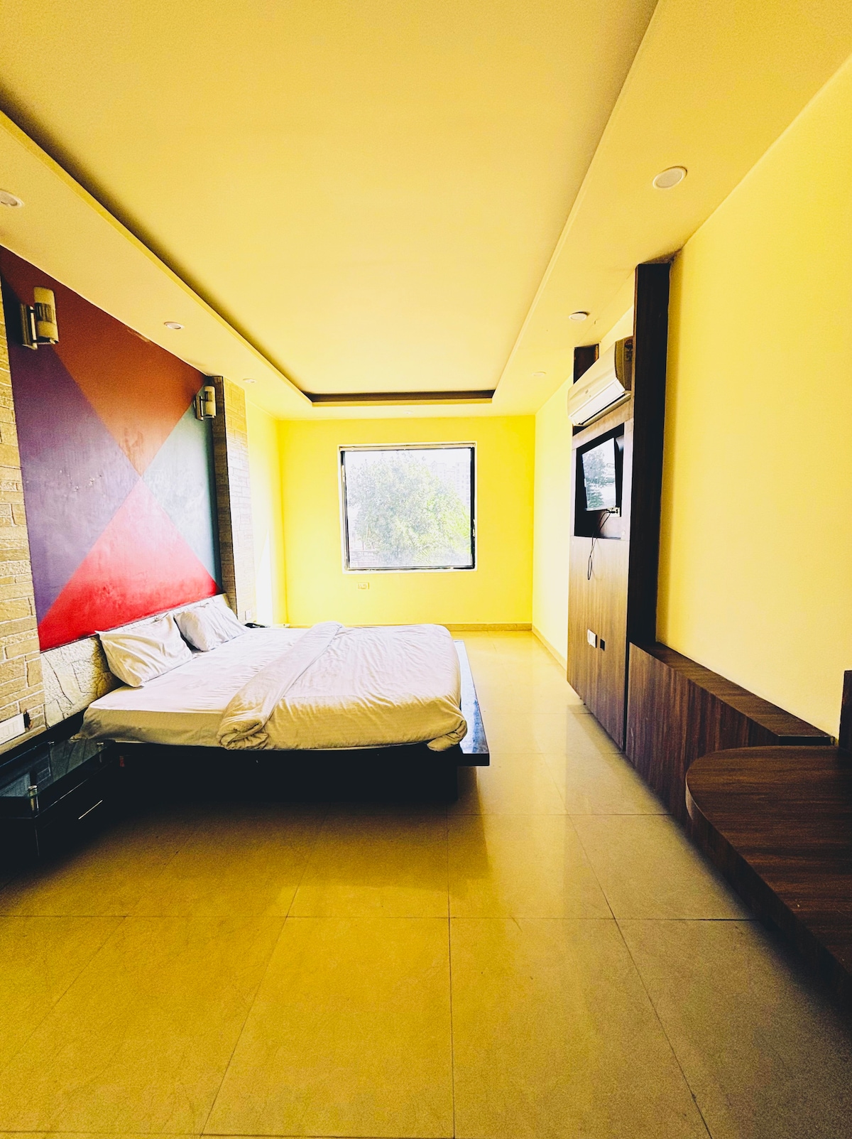 Please Check facility,🤗 1 43" Smart Tv 📺 2 High Speed internet ,🛜 3 one king size bed 🛌 4 A big size attached bathroom/Geyser🛀 5 A balcony space back side 🛋️ 6A Big size 3 seater sofa for relaxing💺 7A full equipped share kitchen with all utensils,🍲 8A big size lobby area near for sitting🧘♂️ 9 Hair dryer👶 10iron facility,🧺 11 Ro is installed for fresh water ,🍶 12clean bedsheet and blanket,🧤 13Daily house keeping 14 Security camera are install for Safety/Car parking 📷