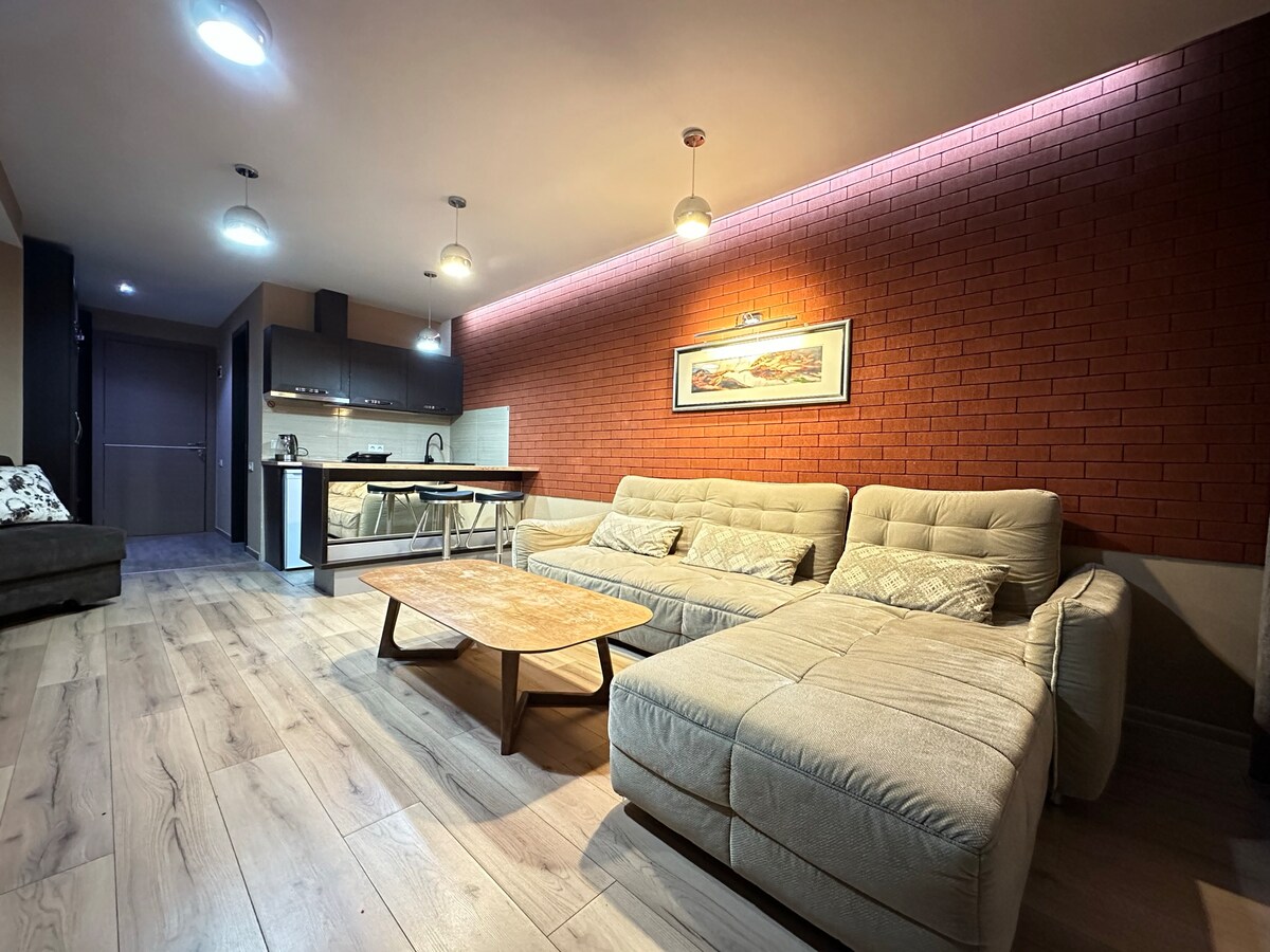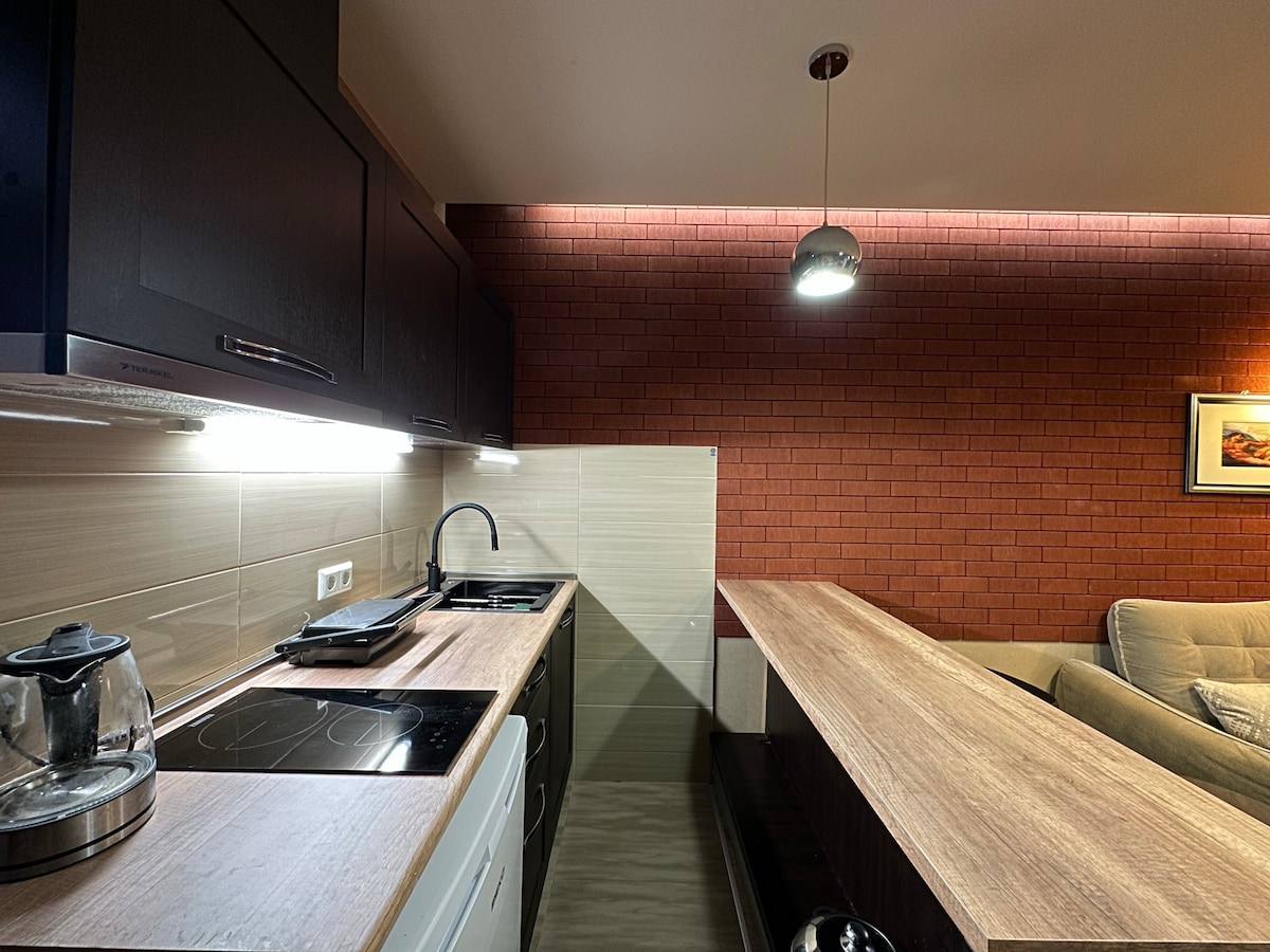 An apartment for rent in Gudauri, located in the 5-star hotel "Gudauri Loft." The hotel is ideally situated next to the first ski slope. The room features a corner kitchen, a bathroom, a refrigerator, a toaster, an electric cooker, an electric kettle, and various other kitchen appliances for your convenience. Additionally, the room includes a plasma TV, high-speed internet, free Wi-Fi, stylish furniture, fresh bed linen, and towels. We wish you a pleasant and memorable stay!