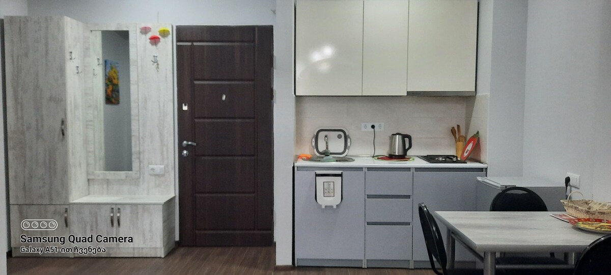 Mənzil Qondoladan 50 metr məsafədə, Yeni Qudauridə yerləşir. Qonaqların böyük bir bazar, restoran, kafe, kazino, xizək icarələri və ən əsası, hər şey sadəcə bir daş atmaqdır. Qonaqların bütöv mənzilə (studiyaya) çıxışı var: mətbəx, yataq otağı, qarderob qarderobu və bütün lazımi imkanlar, eləcə də balkondan ağ dağlara qədər gözəl mənzərə.