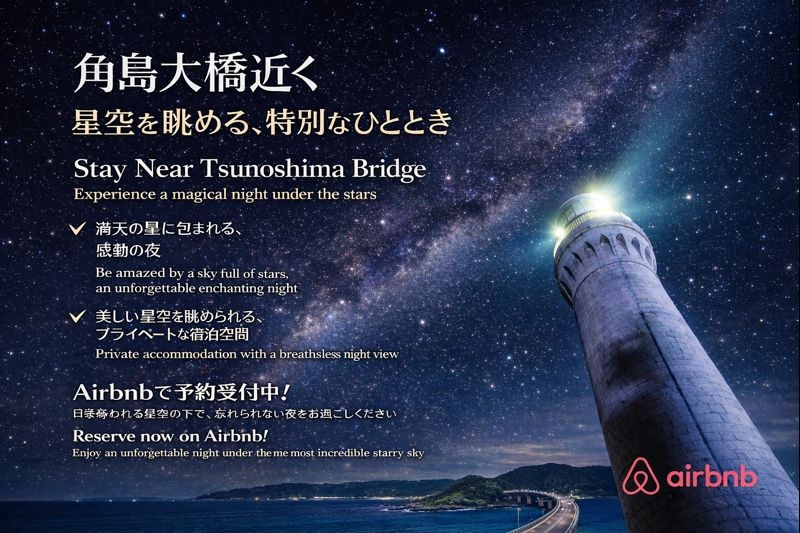 Located close to the amber ocean and Tsunoshima Bridge. The building is located in harmony with nature. Easy access to Shimonoseki/Fukuoka/Hagi. Unique stay Stargazing. Reaaxing retreat. House with Free Parking. Peaceful Seaside retreat with Ocean Breeze. we are accepting up to 1and3 people. Access ✈ 1 hour and 20 minutes from Ube Airport. ✈ 1 hour and 30 minutes from New Kitakyushu Airport. 🚗1 hour from Shimonoseki IC. 🚗1 hour from Mine IC. 🚊&🚗8 minutes by taxi from Agawa Station.