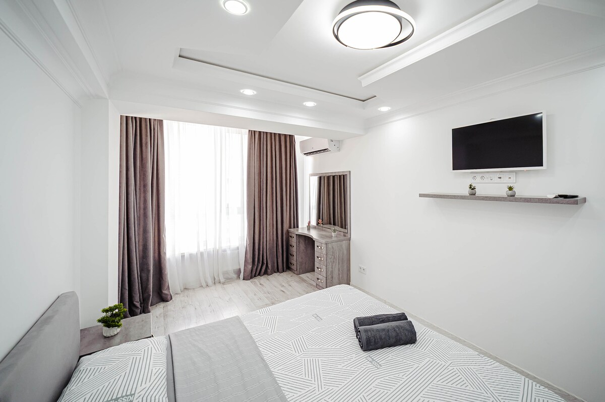Valea Trandafirilor Parkının mərkəzində 2 yataq otağı və qonaq otağı olan və təbiətə xüsusi mənzərə təklif edən geniş mənzil – vis-à-vis Malldova. Kompromissiz təcrübə üçün geniş qonaq otağı, müasir dekorasiya, 2 rahat yataq otağı və 2 tam təchiz olunmuş hamam otağı. Təchiz olunmuş mətbəx, sürətli Wi-Fi, kondisioner, televizor, paltaryuyan maşın. Yeraltı parkinq daxildir Sakitlik, əlçatanlıq və rahatlıq axtaran ailələr, turistlər və ya işgüzar səyahətçilər üçün idealdır