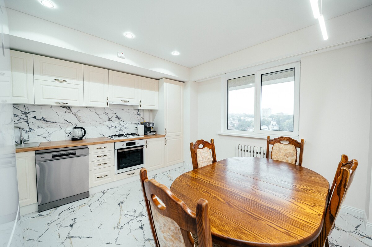 Relaxează-te într-un apartament elegant în inima Chișinăului, cu finisaje din marmură și lemn natural. Te vei bucura de o saltea premium Vi-Spring Bedstead, o cadă spațioasă și un balcon cu șemineu decorativ. Apartamentul are perdele cu telecomandă și espressor cu cafea pe boabe Blocul beneficiază de recepție și pază 24/24, oferindu-ți un plus de siguranță, confort și liniște pe durata întregii șederi.