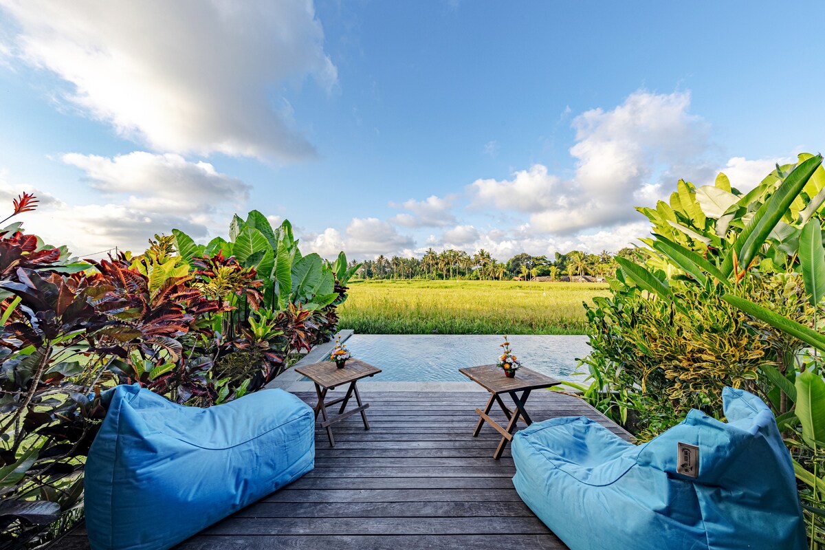 Məkan, sükunət və təbiətin gözəl şəkildə birləşdiyi gizli romantik məkan. Ubud Mərkəzinə cəmi 5 dəqiqəlik məsafədə yerləşən bu geniş şəxsi villa tənhalıq və rahatlıq arasında mükəmməl tarazlıq təklif edir. Cütlüklər və bal ayı üçün təbiət qoynunda açıq havada xəyali vannası və yamyaşıl mənzərəli sonsuzluq hovuzu. Ekoloji təmiz konsepsiya olan villa təbii materiallardan, açıq hava axınından və tropik bağlardan istifadə edərək sakit, nəfəs ala bilən atmosfer yaradır