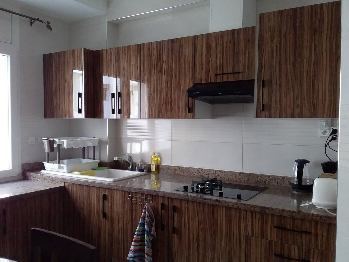 Ailələr, cütlüklər və ya işgüzar səyahətçilər üçün ideal mənzil. 2 yataq otağı: 1 nəfərlik çarpayı 1 nəfərlik çarpayı Qonaq otağı + Yemək otağı (6 nəfər) Vacib ləvazimatlarla təchiz olunmuş mətbəx İsti duş, tualet, güzgü, qüsursuz təmizlik 2 eyvan + 1 terras Kondisioner, pulsuz Wi-Fi, smart TV Lift (mənzil 1-ci mərtəbədə yerləşir) Sakit və təhlükəsiz məhəllə, Mehdia çimərliyindən 15 dəqiqə və şəhər mərkəzindən 5 dəqiqə məsafədə Şəxsi sürücü sorğu əsasında mövcuddur Skuter icarəsi