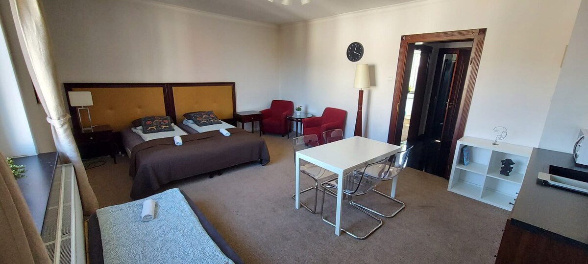 Əla mövqe, Spodek Arenadan, Beynəlxalq Konqres Mərkəzindən, Katovitse Mədəniyyət Zonasından 450 metr məsafədə. Öz-özünə giriş, qəbul Mon-Fri 7:00 - 19:00, təhlükəsizlik və pulsuz, izlənilən parkinq. Kondisionerli, təhlükəsiz, tam təchiz olunmuş, sakit studiya. Yaxınlıqdakı Δabka ərzaq mağazası, mağazalar, aptek, pizza və digər... Əsas ictimai nəqliyyat arteriyası çox yaxındadır. Sileziya Ticarət Mərkəzinə 1,2 km), Legendia, Sileziya Parkına və Zooparka (2,2 km) 5 dəqiqəlik məsafədə.