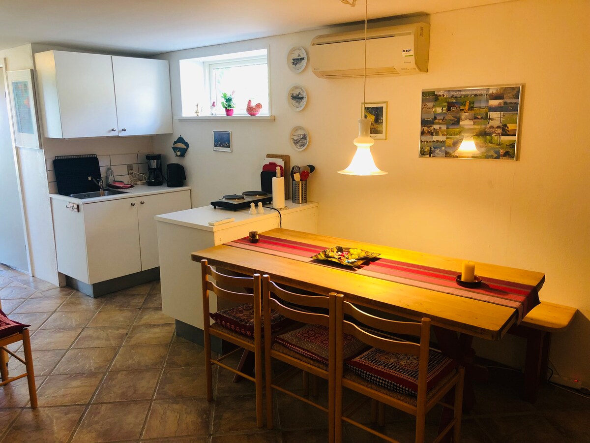 Rigtig hyggelige nybyggede 2 væreles BNB lejlighed tæt på natur og skov! Det er en dejlig lys lejlighed med egen indgang ind til åben stue og fuld køkken, hvor der er mulighed for at lave mad, vaske tøj m.m. Der er badeværelse med brus, og soveværelse med garderobe. Der er sovesofa i stuen, og queensize seng i soveværelset. Der er egen indgang med kode, så du bare kan komme når det passer dig, uden at skulle have udleveret nøgler og du har parkering lige foran indgangen.