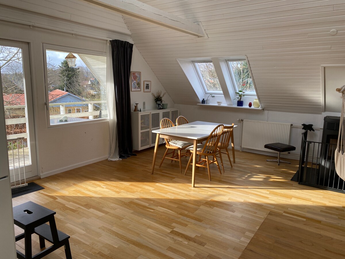 Cosy guest house, which is an independent building on the old school . The flat is 51m2 and has a lovely south-facing private 28m2 terrace. Combined kitchen and living room, a toilet/bath, an entry hall and a bedroom with one queen size bed and two bunk beds. The terrace is furnished with garden furniture, and there is wifi, tv, cromecast and parking near the entry door. Two extra beds can be made in the living room. Bonfire hut, tarzan track, hammocks and a large garden with playground.