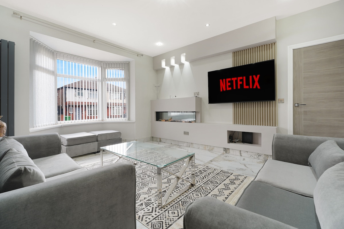 Social Media: 'Manchester Hidden Gem' for direct booking Luxury Private Retreat – Ultimate WOW Factor! Step into indulgence at this stunning gated escape, where elegance meets fun. Unwind in the hot tub, enjoy movie nights in one of two stylish lounges, or challenge friends in the games room. Cook and entertain in the sleek open-plan kitchen, all set in beautifully secluded surroundings. A five-star experience from the moment you arrive. Extremely close to Manchester Airport & City Centre.