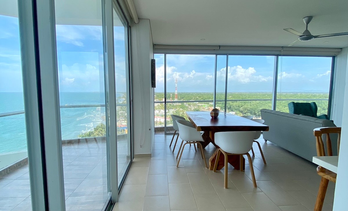 Apartamento moderno pet-friendly en la mejor zona de Coveñas y con la mejor vista al mar que podrás encontrar. El apartamento tiene 3 habitaciones cada una con baño interno. Además, cuenta con una cocina totalmente equipada, zona de labores con lavadora, sala, comedor y 2 balcones tipo terraza donde podrás ver los mejores atardeceres y amaneceres! El conjunto cuenta con un amplia zona de parqueaderos, ascensor, lobby, piscina y zona de playa privada.
