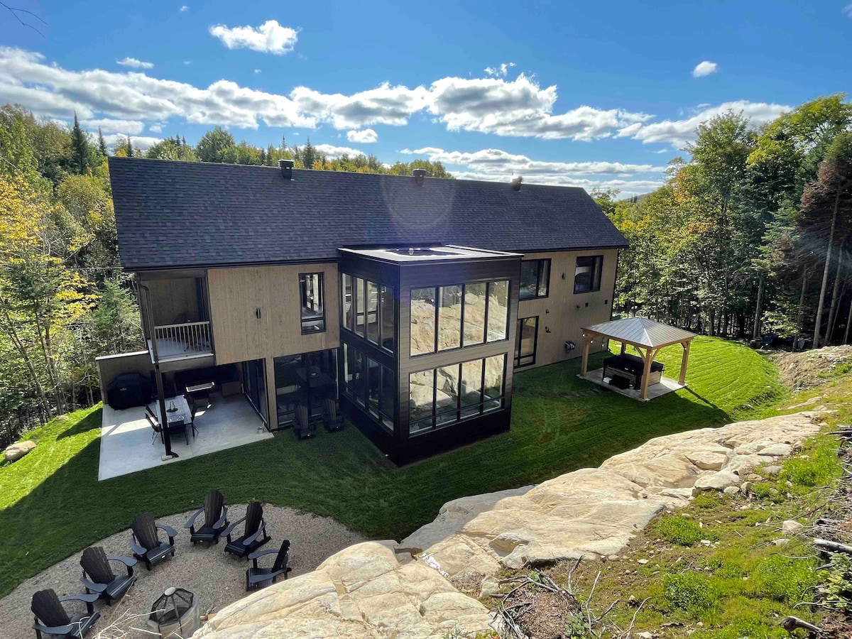 Escape to ROCKHaüs, a stunning modern chalet in the Laurentian Mountains near Mont Tremblant. This 3-bedroom architectural gem comfortably fits 8 guests. It features a panoramic glass dome sauna, a built-in hot tub, and breathtaking mountain views. Perfect for a luxurious retreat, it offers a unique blend of contemporary design and natural serenity with a cozy Scandinavian fireplace and expansive outdoor deck. Experience an unforgettable getaway with high-end amenities and private lake access.