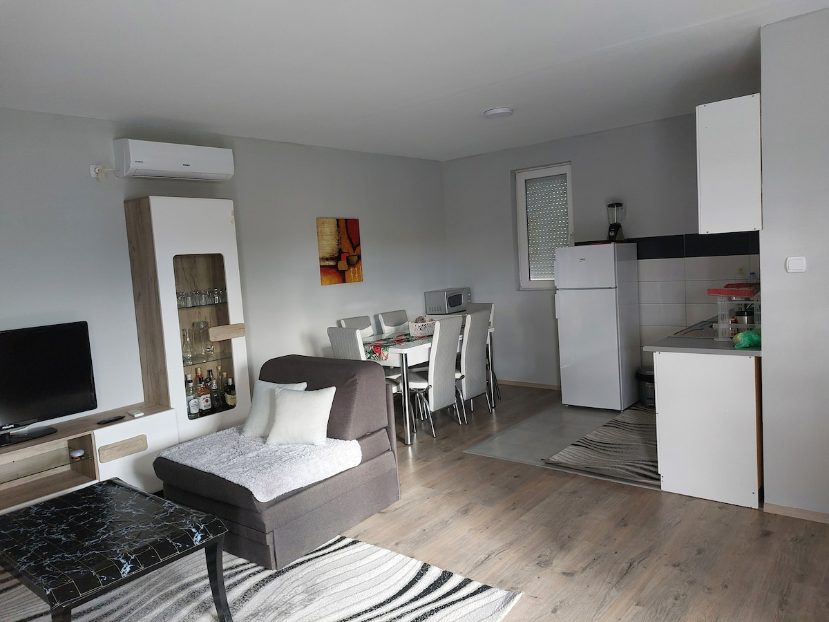 The apartment is located 10 minutes on foot to the strict center in Skopje. Near the apartment there are Ramstore Mall and a bus stop. This apartments is 35 m2, in the common area there is a large double bed and sofa bed. Has AC, brand new kitchen, living room with LCD screen, one balcony, and one bathroom. It is located on a quiet street near the center of Skopje. You won't have to spend a minute in public transport! All the important places in the city are within a 10 min walk.