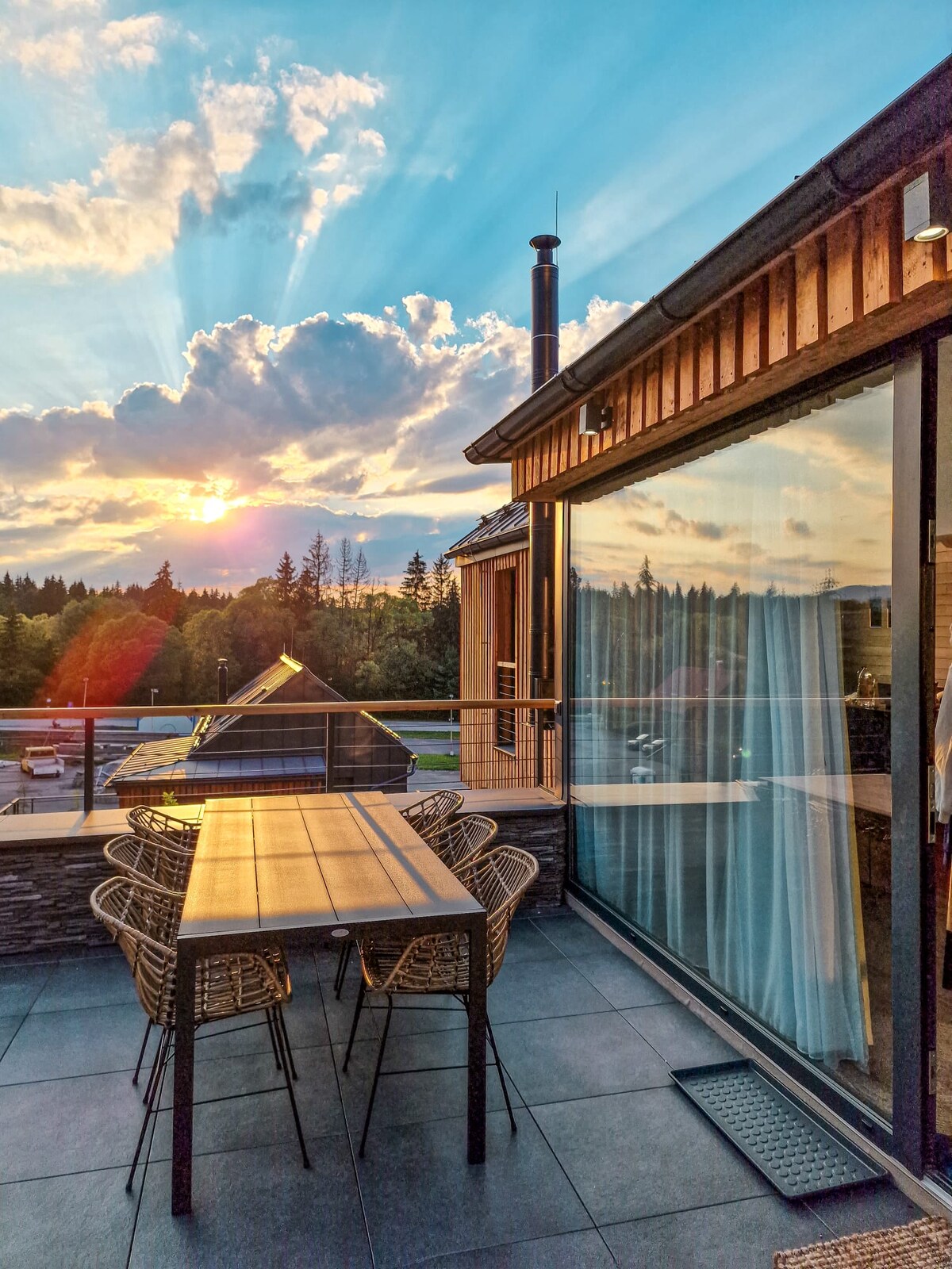 Luxury chalet with an area of 128 m2, which is also equipped with a Finnish sauna and an outdoor hot tub. It has two bedrooms, each with doublebeds and an attic gallery as a bedroom and playroom for 4 +1 children. The gallery is connected by an airy and spacious living room with a fireplace. The Chalet has 3 bathrooms, a heated ski storage room/bicycle storage, 2 terraces, a fully equipped kitchen and a shoe/ski dryer.