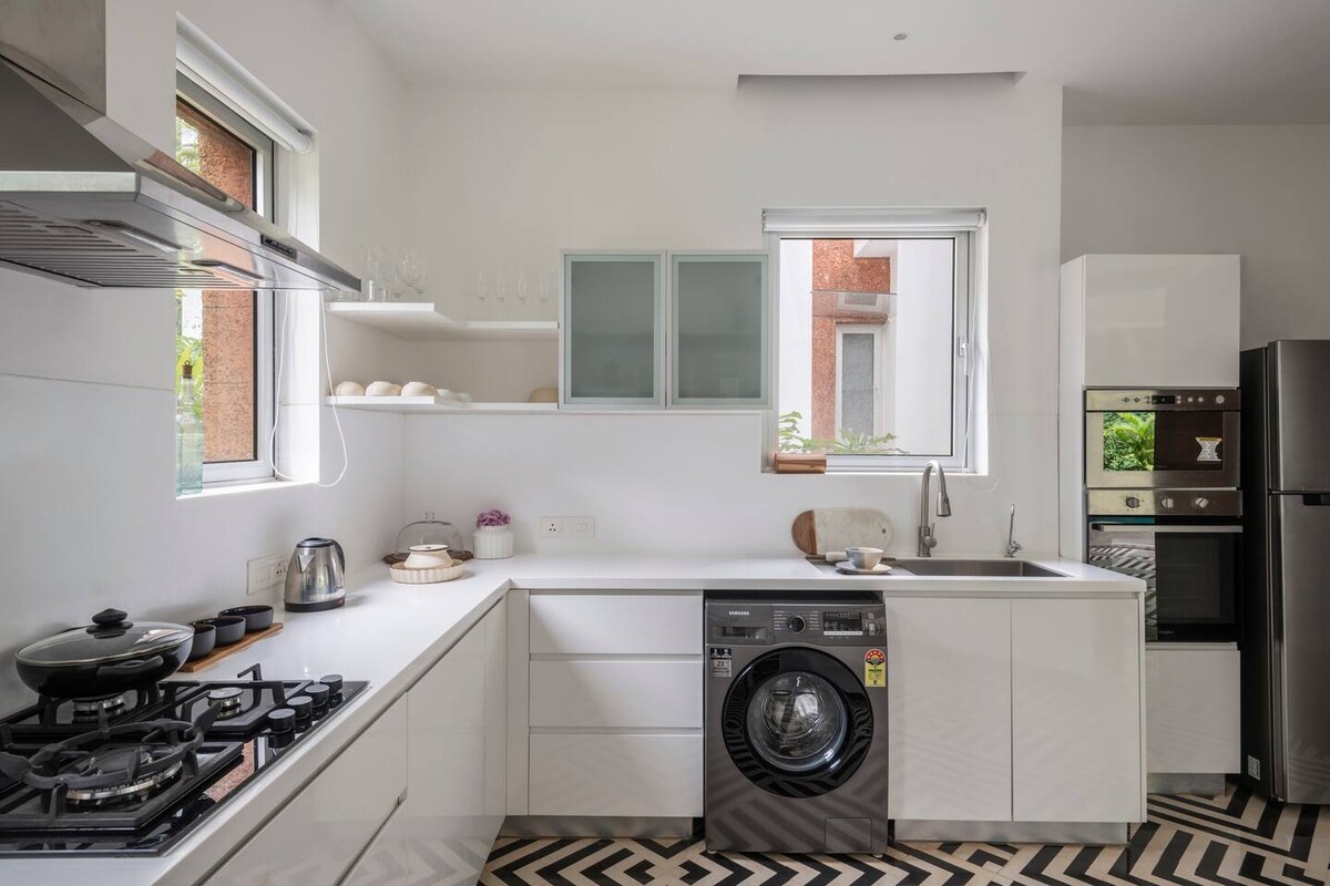 Imagine entering a modern & thoughtfully designed apartment with lush edible balcony gardens that you share with birds & squirrels. Located in Siolim Marna, this 1BHK is designed for couples, solo travelers & offbeat families on a short vacation, a longer workation or a peaceful retreat. We love all things design and DIY. Every piece of furniture has been upcycled and we've tried to think of everything you might need- wifi on backup, a bar, an equipped kitchen, a swing, books & art supplies!