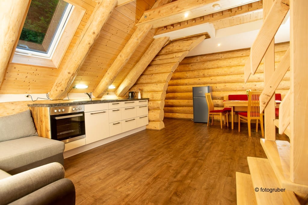 Ferienwohnung im Nebengebäude auf 2 Etagen. Eigener Eingang, Vorraum mit Garderobe und Sauna. Offenes Dachgeschoss mit Küche, Wohn- und Essbereich. In einer Nische ist ein Doppelbett(im Wohnraum) Chillen, Kamin, Fernseher! Terrasse: Sitzgruppe, Sonnenschirm, Gasgrill und Ausblick. +Schlafzimmer - Doppelbett, auf Wunsch Kinderbett. Badezimmer, Badewanne u. Dusche. Badeplatz 20m am Fluss - wenn der Wasserstand es zulässt. Loipe am Haus 15min Skigebiet, 5 See Wandern