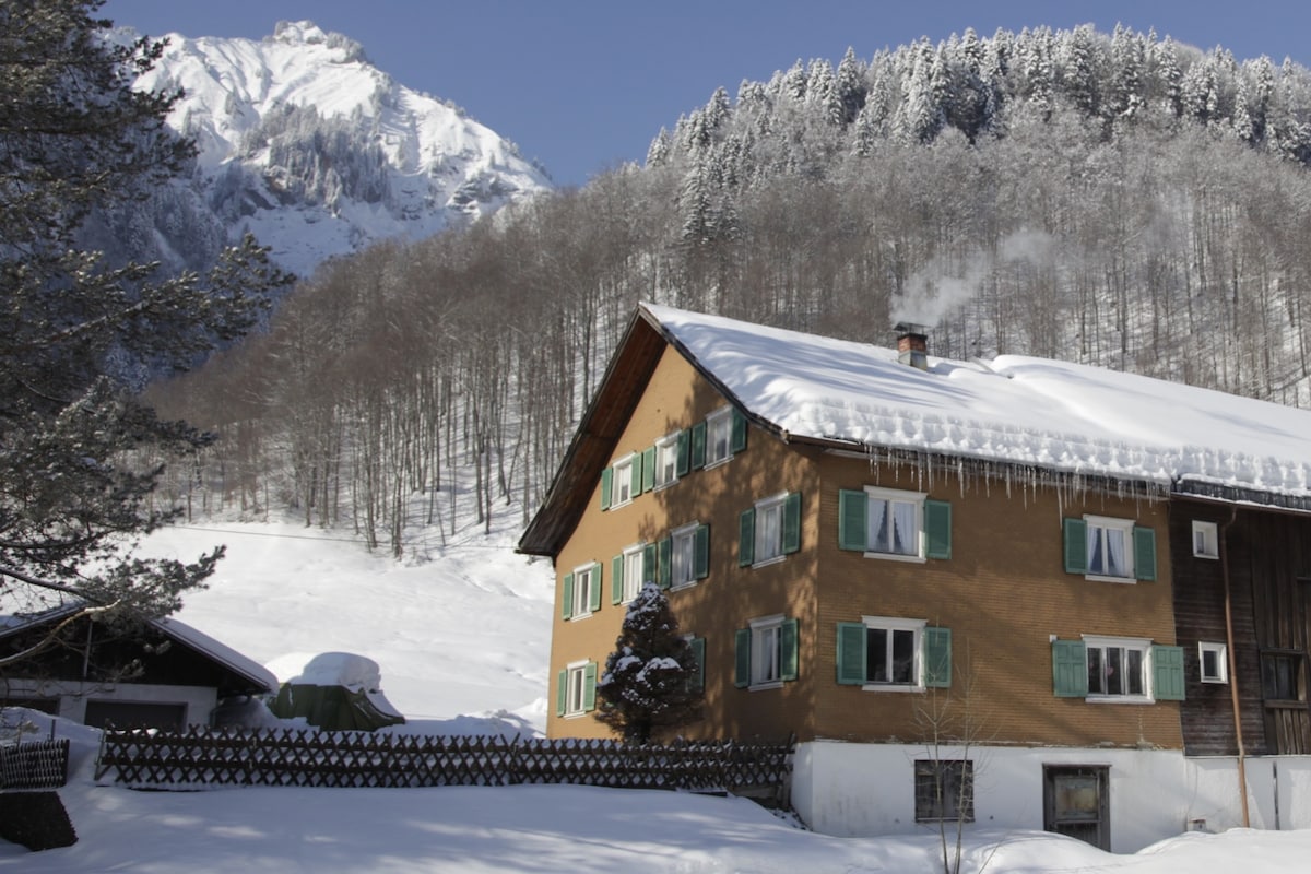 Haushälfte in einem traditionellen Bregenzerwälderhaus: - grosser Wohn-/Essraum - 2 Sanitärbereiche (ingesamt 6 Waschbecken, 4 WCs, 2 Duschen) - 10 Schlafzimmer, - Schiraum, - im Dorf, im Winter gut erreichbar, - Bushaltestelle 100m, - 3 Skigebiete in der Nähe, - ideal Skitouren, Winterwandern, Wandern/Gravel-und MTB-Biken. KEINE PARTIES ODER JUNGESELLENABSCHIEDE. Basispreis und Buchung ist bis maximal 16 Personen (=Kinder jeden Alters inkludiert). Preis für mehr als 16 Personen auf Anfrage