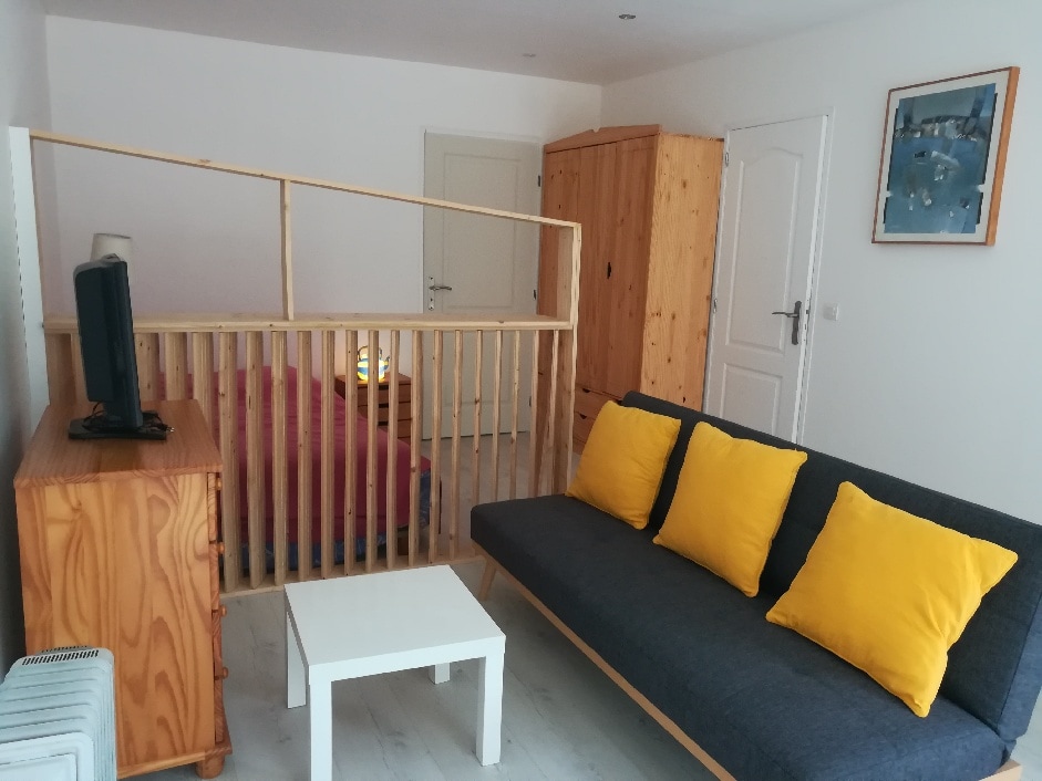 Grand studio de 35 m2 , entièrement neuf, tout confort. Location possible nuit, semaine, mois. Le studio accueille 3 adultes maxi où 2 adultes + 2 enfants, 1 lit 140+1 canapé convertible 120 en lit. L'ensemble est entièrement équipé : meubles, cuisine, vaisselle, micro-onde, four, frigo, plaque 4 feux, machine à café KRUPS DOLCE GUSTO bouilloire, linge de lit serviettes. Un rez-de-jardin au calme, avec table, chaises, vous permet de manger à l'extérieur. Parking privé situé près du logement.