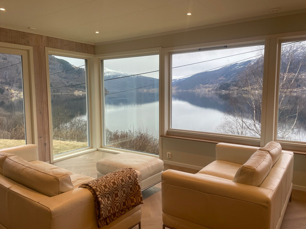 Newly built cabin with panoramic views of Lustrafjord and Feigefossen waterfall. Just 100 meters from the fjord, across an open grass field. Bright, modern interior with large windows. Perfect base for hiking, biking, and skiing. Located next to Nes Gard – a respected farm stay with restaurant, wine bar, sauna, and hot tub available for booking. Quiet, scenic, and fully equipped for a comfortable stay.