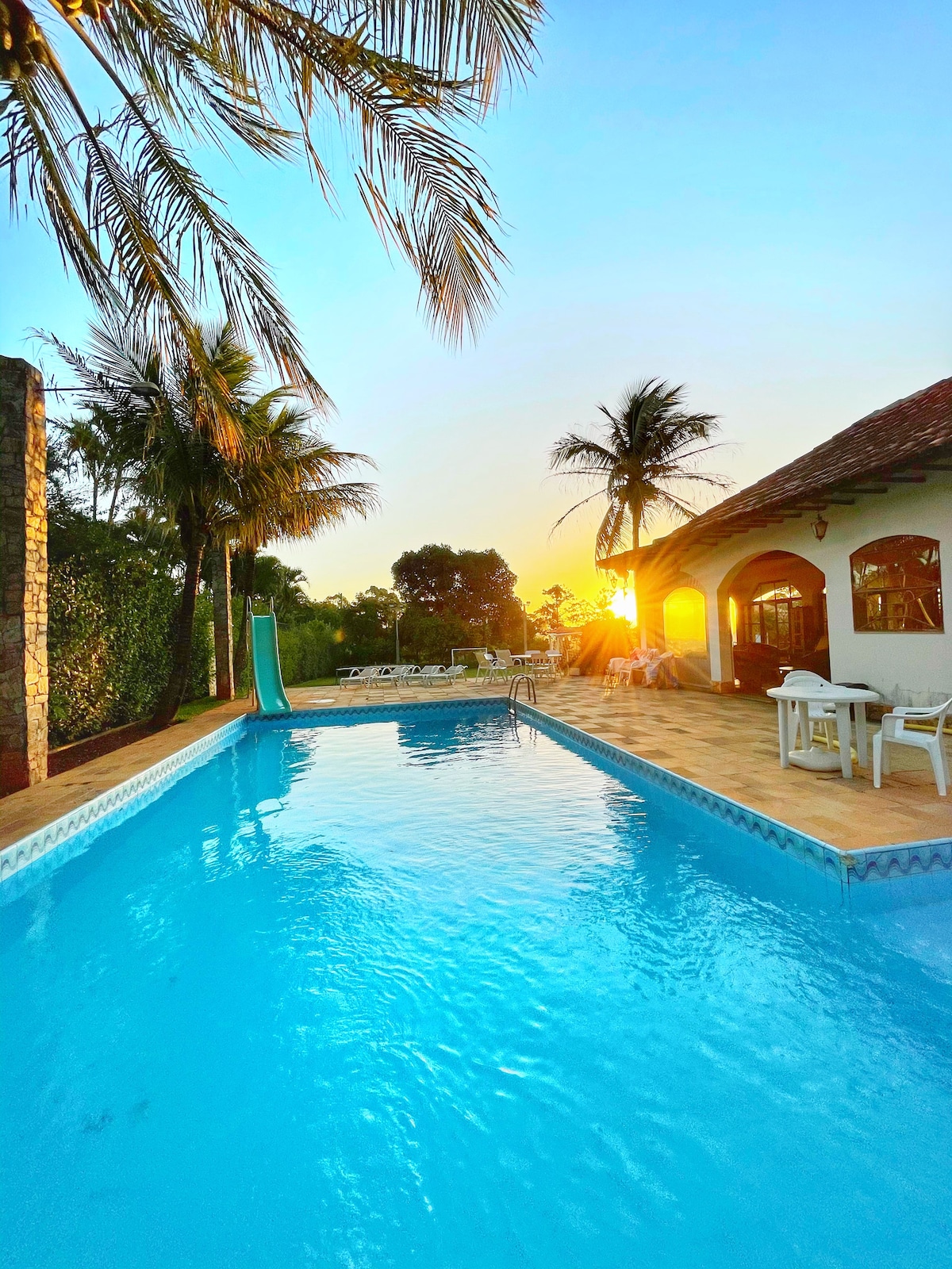 Temos uma piscina gigante, mesa de bilhar, pebolim, ping pong, basketbool, piscina de bolinha, pula pula e uma varanda maravilhosa com uma cozinha super equipada 👨🏻🍳 Aqui você tbm encontra um pôr do sol incrível 🌅 e pra uma noite mais fria temos lareira, kit fondue e Netflix em uma cama com massagem 🥰 5 minutos de estrada de chão, mais dps é só alegria, 3 casa pra baixo tem a mercearia do caseiro que pode te auxiliar 🍻🍫🍿espero ter a oportunidade de receber vcs 📲 @chacaraalegria10 ❤️