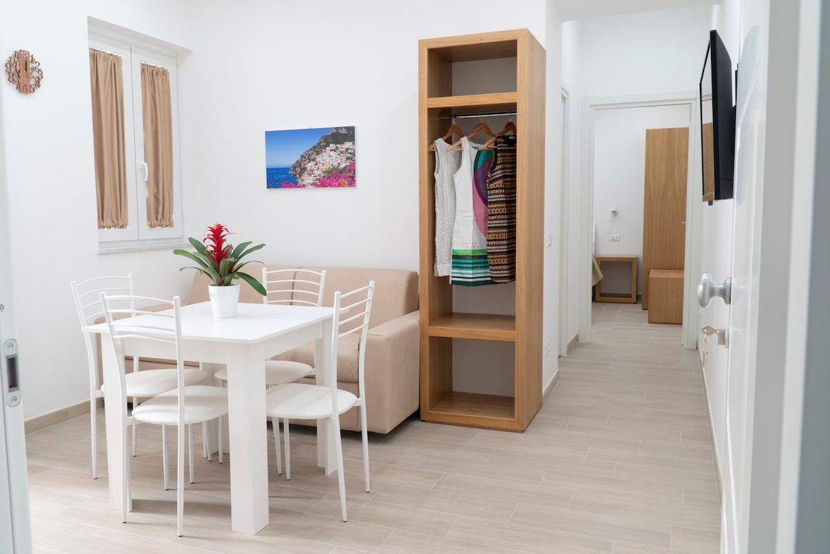 Olympia orijinal mühiti qorumaq və artırmaq üçün təmir edilmiş və bərpa edilmiş tarixi əhəmiyyətli mənzildir. İçərişəhərin əsas turistik və mədəni yerlərinə yaxın olan imtiyazlı və dominant mövqe geniş pəncərələrdən Amalfi Sahilinə və dənizə heyran olmağa imkan verir. İki nəfərlik yataq otağı və qonaq otağındakı tək divan 3 nəfər yerləşə bilər. Julius Studio ilə Trotula Cazibədar Evinin bir hissəsidir və 6 nəfərə qədər qonaq qəbul edə bilər.