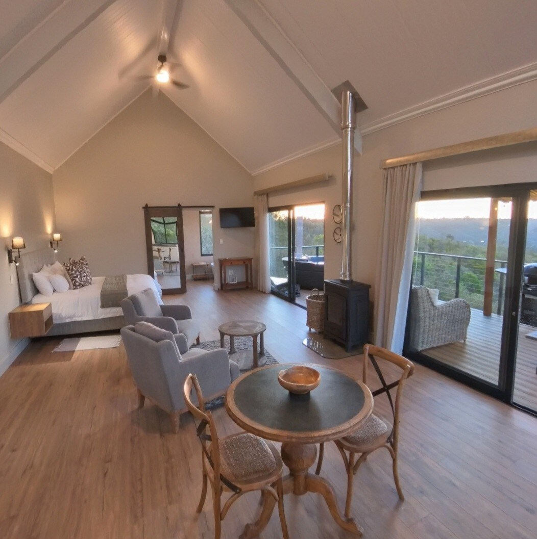 Open plan modern cabin located in a natural forest with magnificent mountain views. Enjoy lounging on the sundeck or cool down in your own private plunge pool right in front of your bedroom! Big glass panel sliding doors open up the space to get you even closer to nature. The kitchenette is equipped with a gas hob, kettle, microwave and nespresso coffee machine. The sun terrace with braai area and sunloungers offers uninterrupted mountain views.