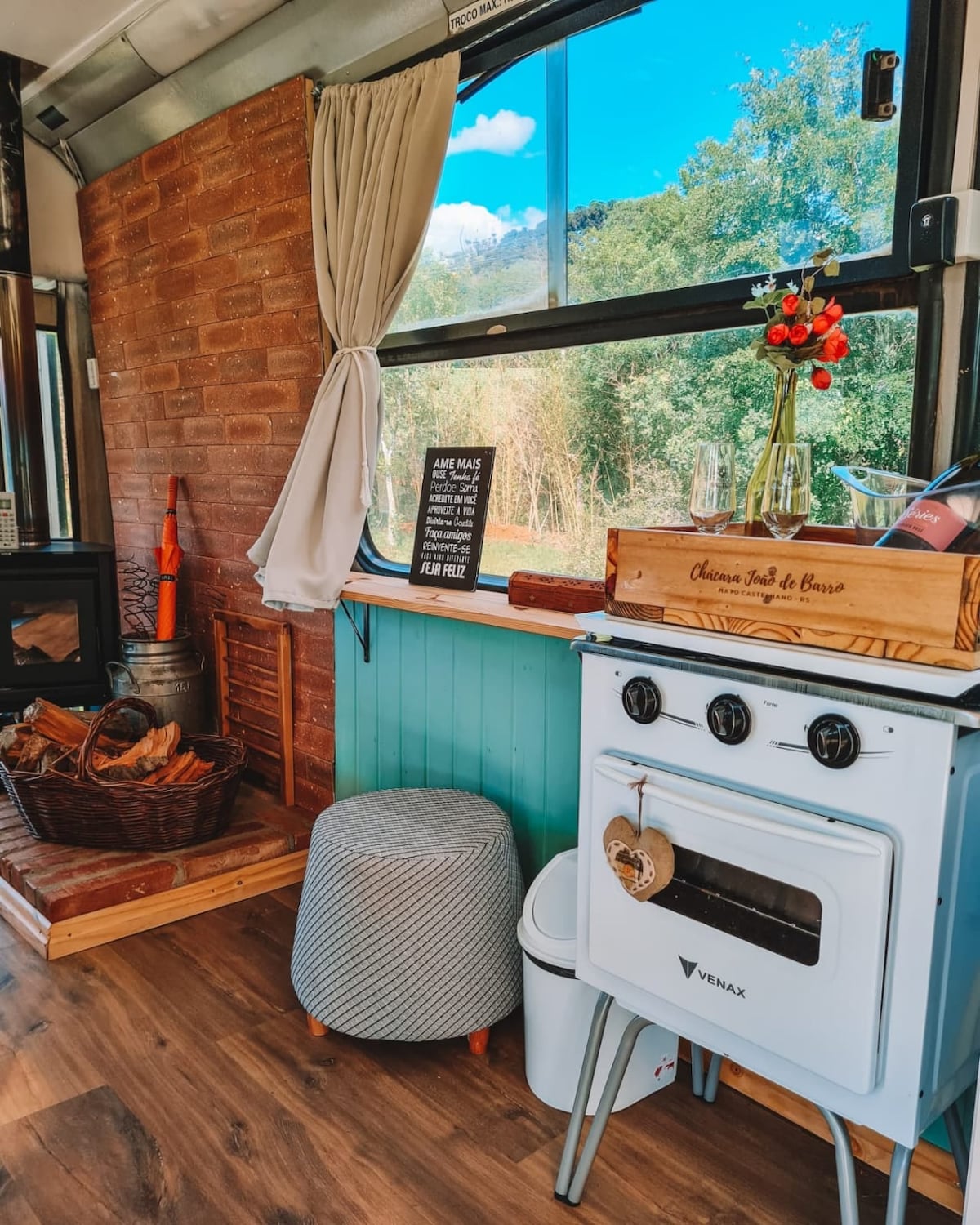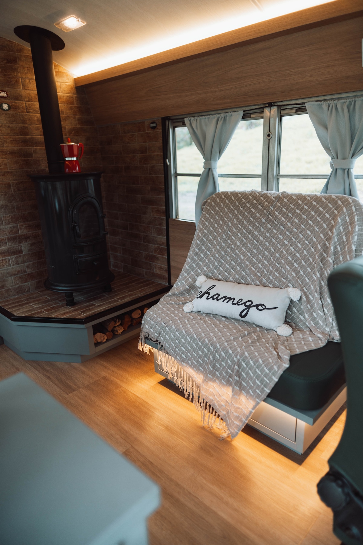 Mais que uma hospedagem. Uma experiência única! Um ônibus fixo num local com vista para os morros, todo revestido em madeira, muito aconchegante, com uma cama king size, ar-condicionado, projetor para ver filmes, Wi-Fi, banheiro com banheira de hidromassagem, chuveiro à gás, cozinha completa, área externa com parrilla argentina para churrasco, chuveirão, spa de 4 lugares com hidromassagem, deck no teto do Busu, área de fogueira e redário, todos os ambientes com vista espetacular!