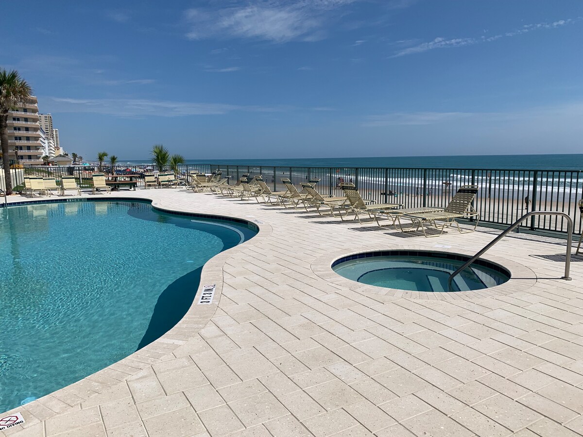 Bu dəbdəbəli çimərlikdə yerləşən kondominiumda sudan cəmi bir neçə dəqiqəlik məsafədə rahat tətildən zövq alın. Bu 2 yataq otaqlı, 2 vanna otağı olan kondominiumla bütün ailə gözəl Daytona-Biç sahil xəttindən zövq ala bilər. Kondominium döşəmədən tavana qədər pəncərələrə malikdir, maneəsiz çimərlik mənzərəsi və tonlarla təbii işıq təklif edir. İçəridə qalın və ümumi otaqda suya baxaraq dincəlin və ya hovuz və cakuzidə istirahət etmək üçün bayıra çıxın. Erkən oyanın və ya çimərlikdən, ya da bu kondominium rahatlığından günəşin doğmasına baxın.