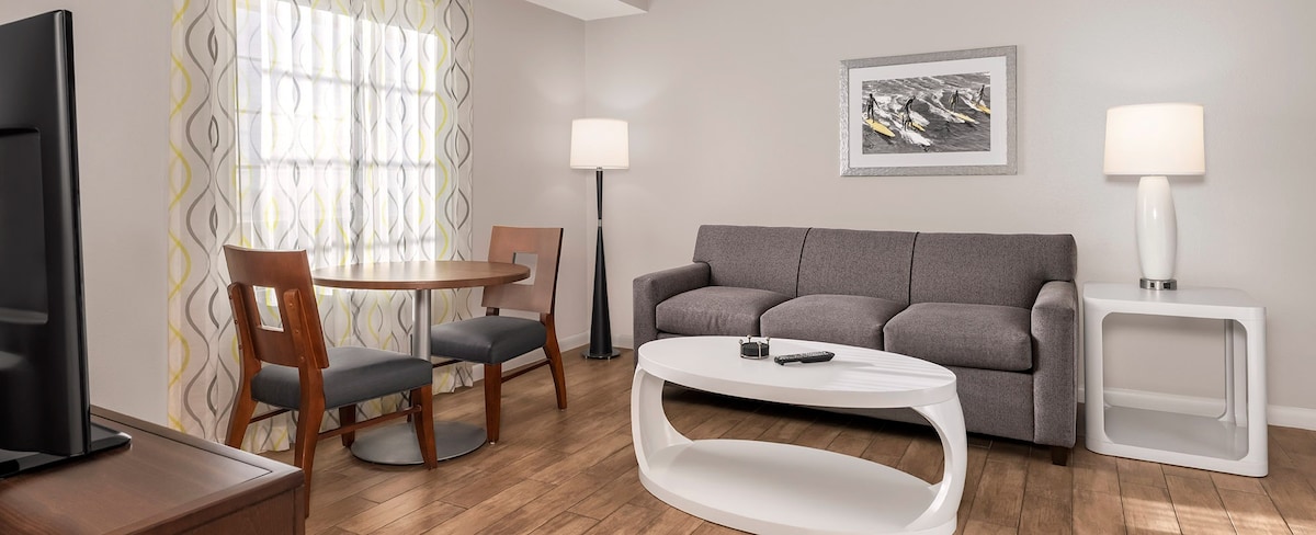 Enjoy a relaxing stay in the Horizon Suite at Atlantic Shores, featuring a full kitchen and space for the whole family, including doggies 🐶, just literal steps from Daytona Beach 🌊. This bright, spacious suite includes a king bed, twin daybed, and queen sofa bed, sleeping up to 5 guests. Cook your fav meals in the fully equipped kitchen with coffee maker, waffle maker, toaster, cookware. Parking, Wifi, TV streaming included